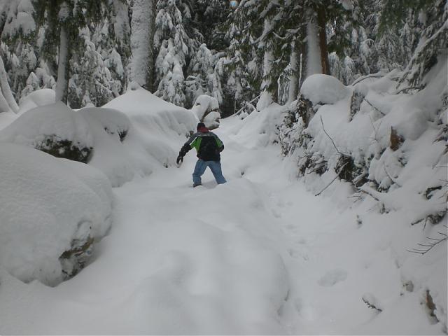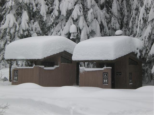 Following pics are the 3 way climb on 311, the landing, and the always required snow depth picture of the bathrooms at the campground.