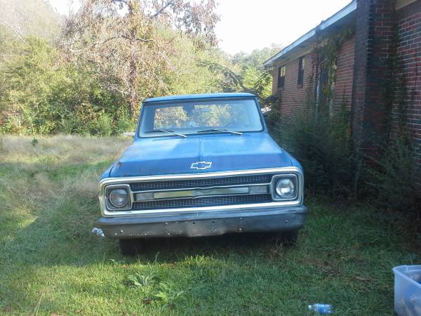 ive decided to sell my farm truck, its a '70 chevy c-20 long wheel base, bench seat, manual in the floor, vintage air(not working), all glass is in, bench seat, most of the gauges does work, minor surface rust, body isnt dented up, its fairly straight, theres just a cpl of spots at the back corners of the cab that is rusted. this isnt a show truck, would make a good shop truck or rat rod. runs and drives. open to trades pending on what it is, vehicals or older model campers only(tear drop or canned ham). selling as is, theres no ***le, alabama doesnt require a ***le for this year model, $1700 obo