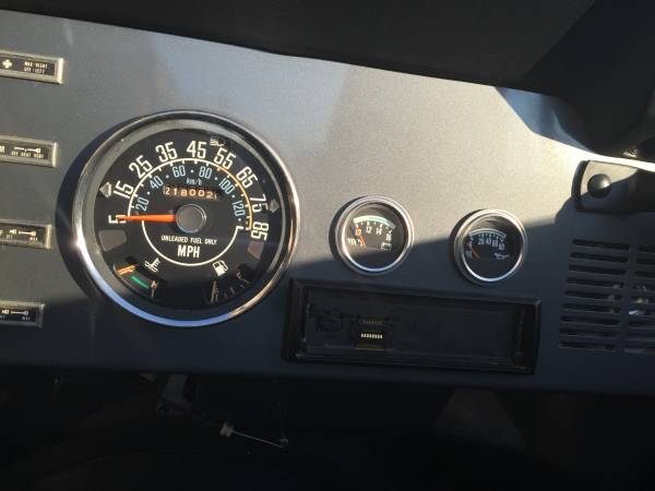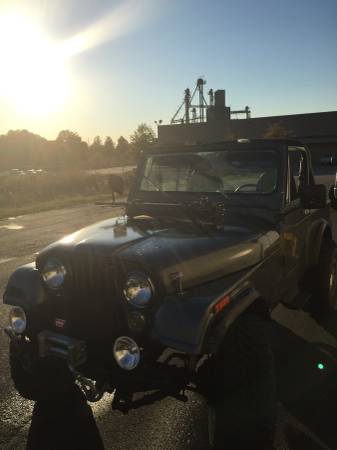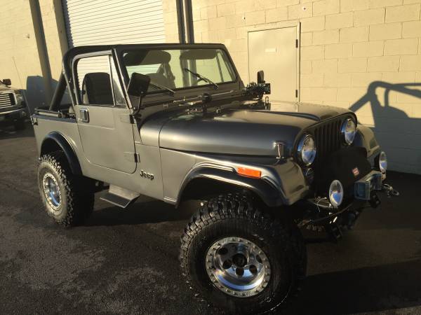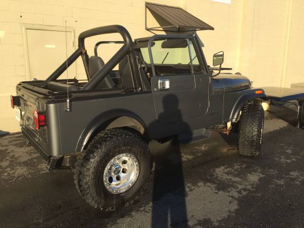 1984 Jeep CJ-7, body restoration completed 2011. Body tub, hood, fenders, tailgate, doors, windshield frame & dash professionally sandblasted to bare metal. Repainted to Gun Metal Metallic color. Interior and underbody of body tub and fenders Line-Xed. Original engine, 5 speed. The temp & gas gauge worked prior to restore but were accidentally not hooked up during rebuild. The hardtop needs new lift gate shocks.
