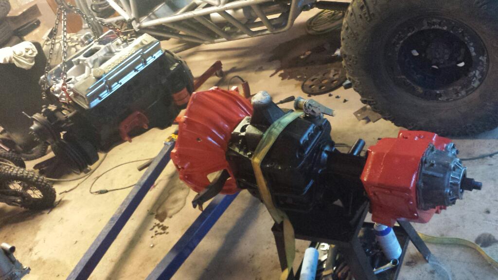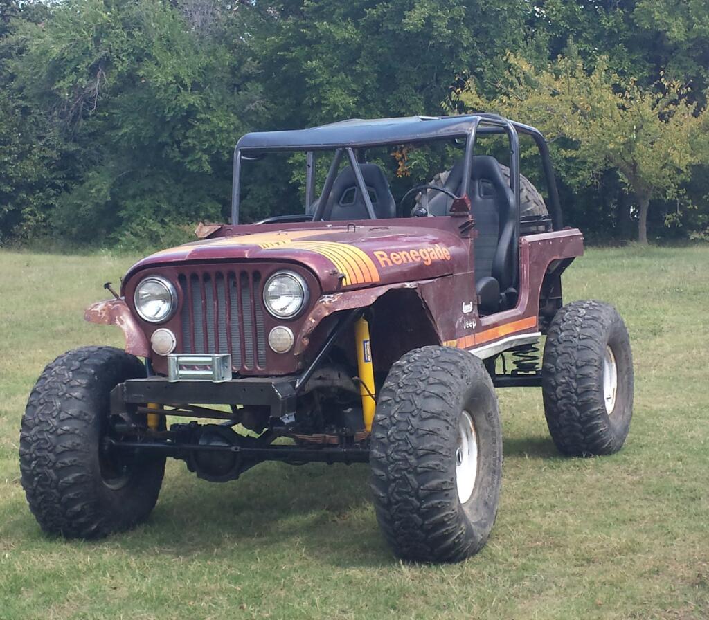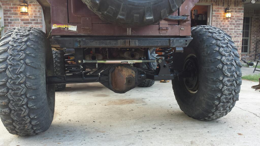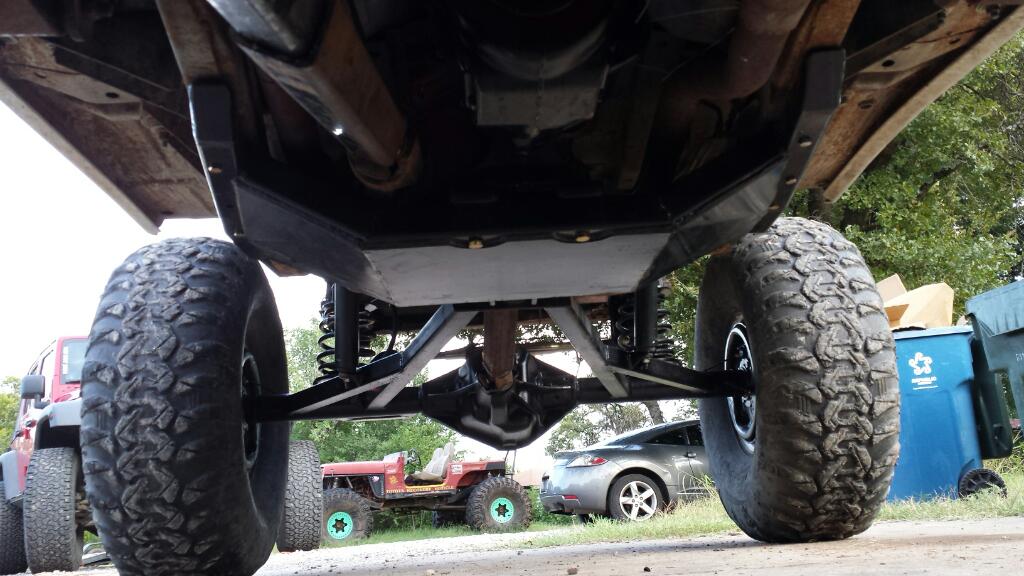 It now has a cammed 350 in it, with a warped wiring TBI fuel injection kit. Its got a sm465 trans with a stock clutch... and a 205 tcase behind it. Drive shafts have all new ujoints and are 1/4 walled square tubing. Front axle is a dana 44, rear is a 60. Havent opened either of them yet, so no clue on gearing yet. Front is leaf sprung, rear is a quick one link with a 1-1/4 ruffstuff hiem, attached to a very very heavy duty skid plate/ crossmember. Sitting on some used 39.5 iroks with 15" steel wagon wheels. Probably 50% 55% tire life left... and somehow only one tire barely leaks! Get low after about a month or 2 of sitting. Rear has stock jeep JK springs and shocks.