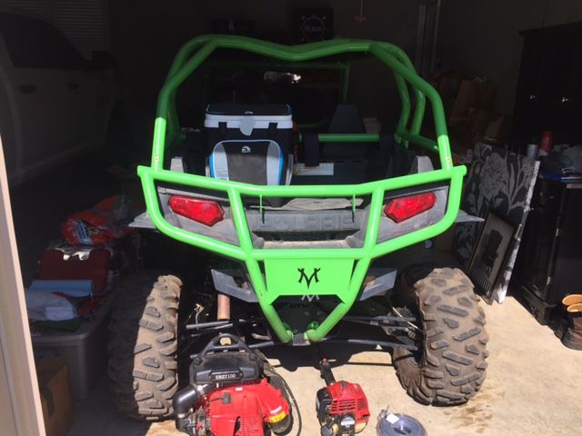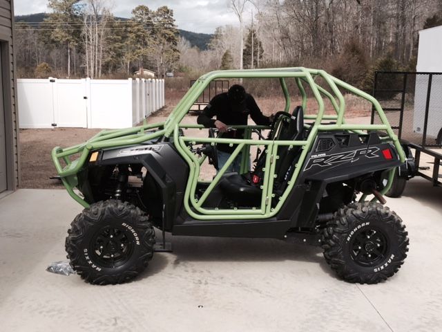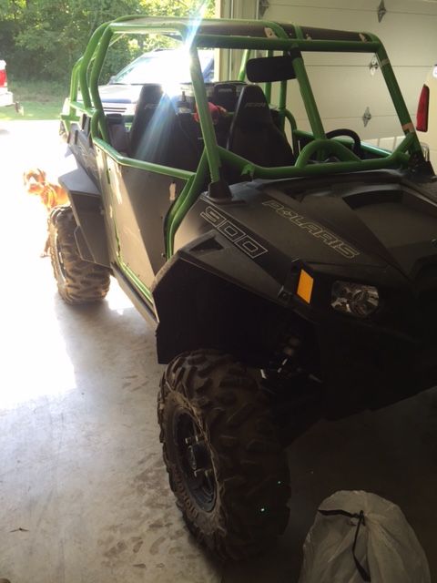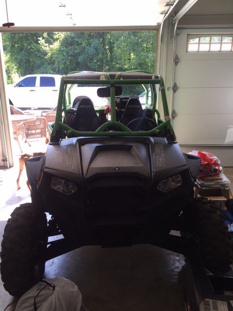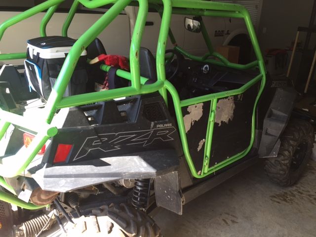 Stealth black 2014 XP 900, lime green cage (Not sure if it is DOM or not), full 3/4" UHMW skid plates, trailing arm skids, a-arm skids. Still under RPM extended warranty. Cage has front bumper with hood bars that is included but not installed. The powder coating on the body panels needs to be redone because they were not scuffed properly and the powder didn't stick well. The RZR has never been in the mud. It has been layed over on the passenger side twice but never all the way over. It is in good shape and has been dealer serviced. Has 3 inch padded harnesses on both sides. Comes with stock cage and skid plate.
