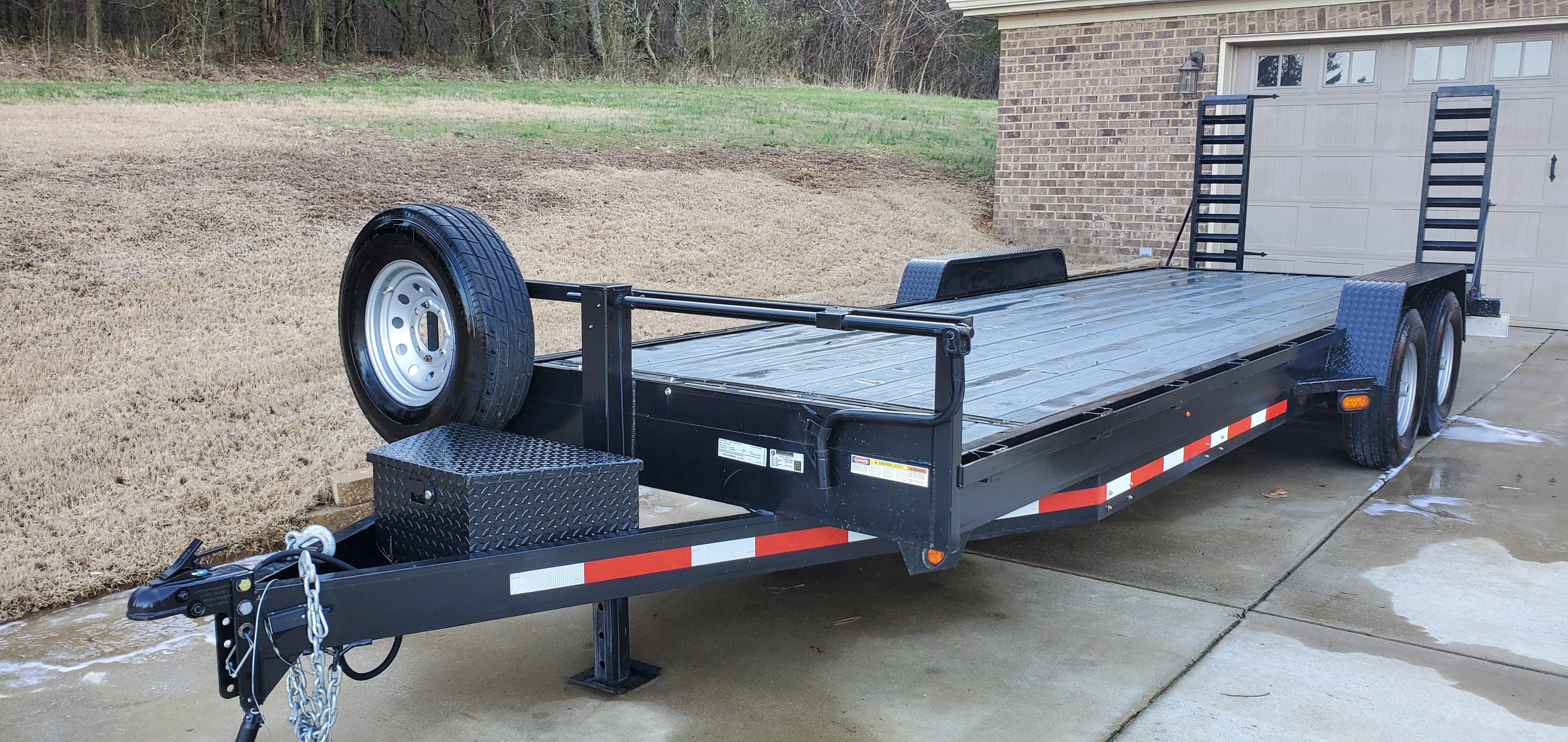 2018 lone wolf 24' equipment trailer with dovetail. 14k lb 8 lug axles with brakes on both. Breakaway box with backup battery. HD fold up ramps with spring assist. All LED lights with reverse lights. Toolbox, HD drop jack. Adjustable 2 5/16 coupler. Spare tire with mount. Radial tires in excellent condition. Floor has been stained with exterior grey deck stain. also has high lift jack mount on frame.