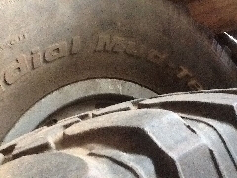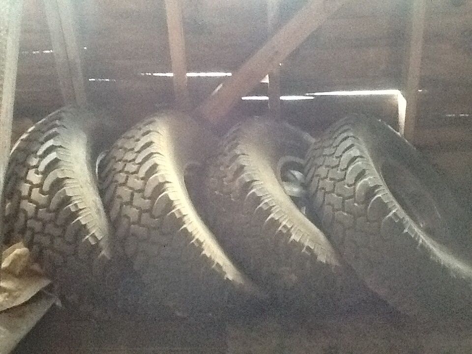 These are the original mud terrains. One has dry rot the other 3 are fine. 2 are on stock yj wheels the other 2 are on white wagons 5 x 5 1/2 . The other 2 wagons come with the tires. 2nd pic is the best tire. 3rd is the worst tread. 4th is the dry rot.