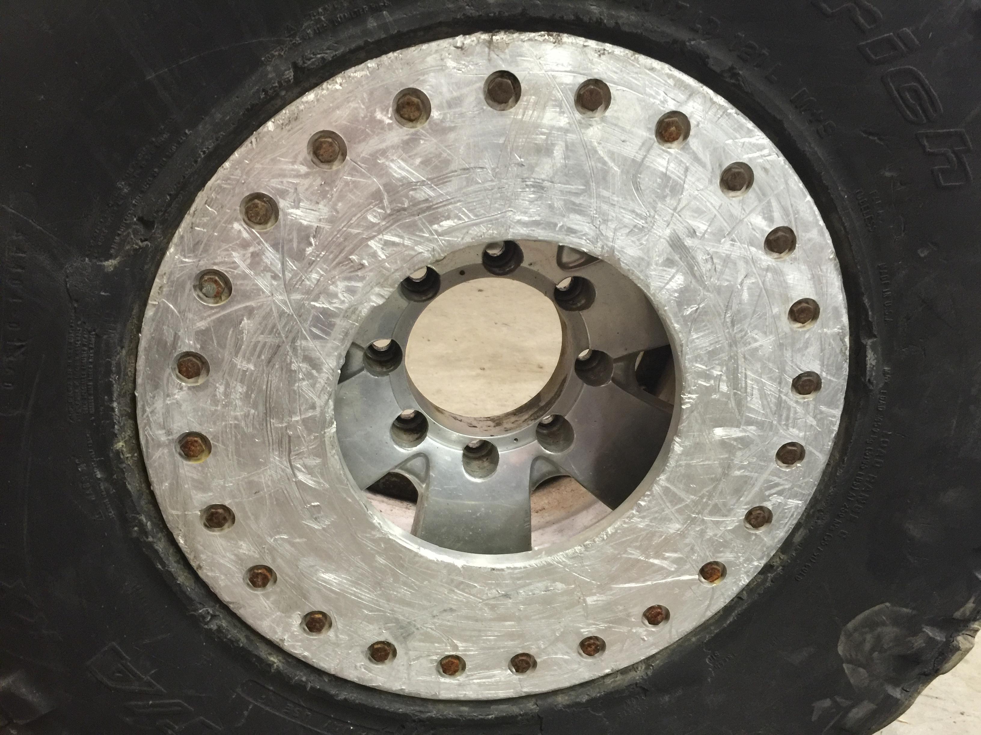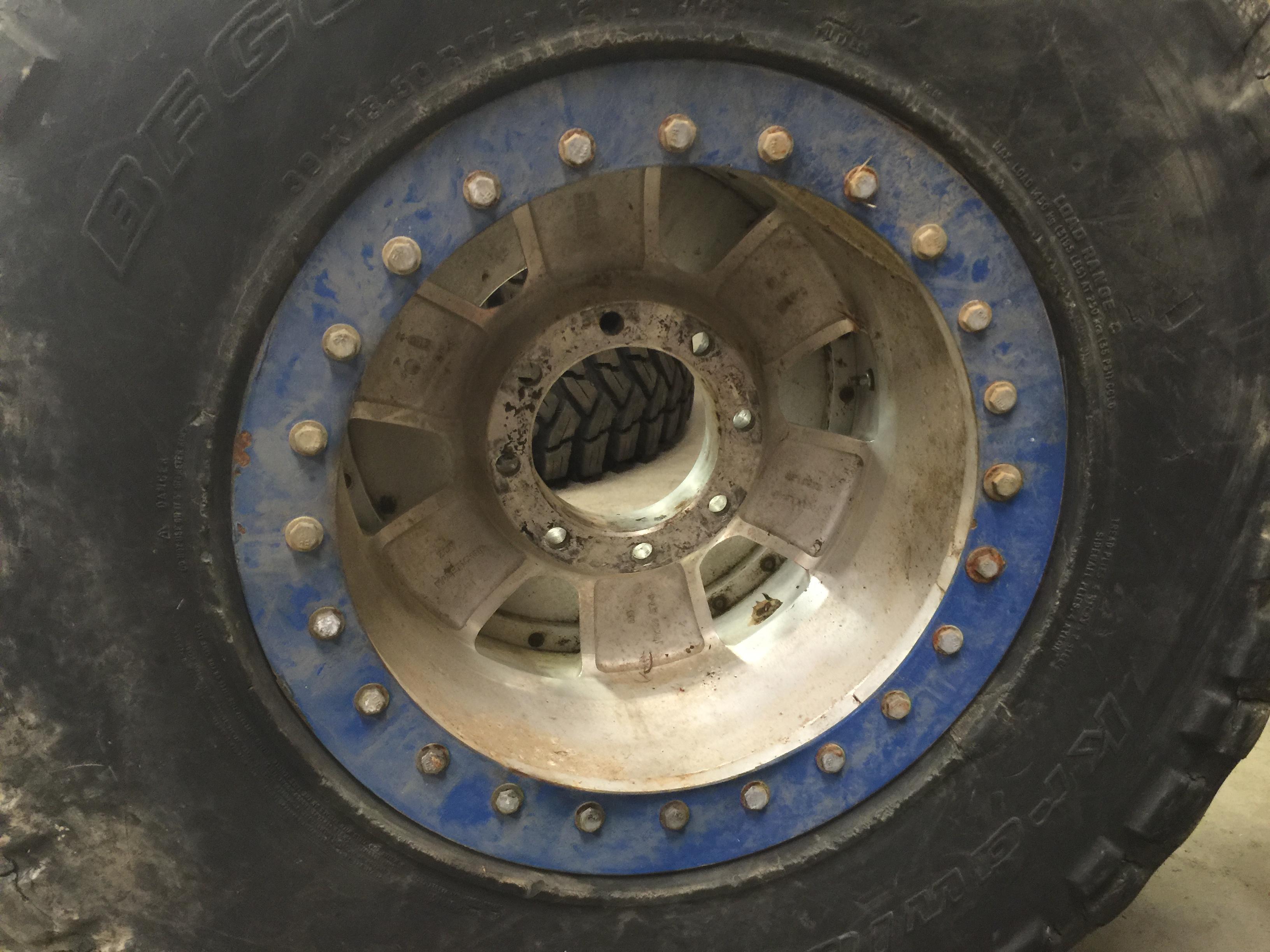 I've got 4 well used 39" BFG reds (maybe 30%-40%) on a set of 17" 8x6.5", 5.5" BS aluminum wheels with weld on beadlocks. Two of the wheels are actually double beadlocks. These were on a rig I bought a couple years ago. I took them off and put on another set of wheels and tires I had. They've just been sitting in the shop since then. They do leak down over time, but I don't know if it the tires or wheels leaking. I think it's the wheels though. They have a second valve stem hole like they had internal beadlocks at one time. Instead of tapping and plugging the hole it looks like the used a bolt and a piece of rubber to try to plug it. I think you could tap it and use a pipe plug and be just fine.