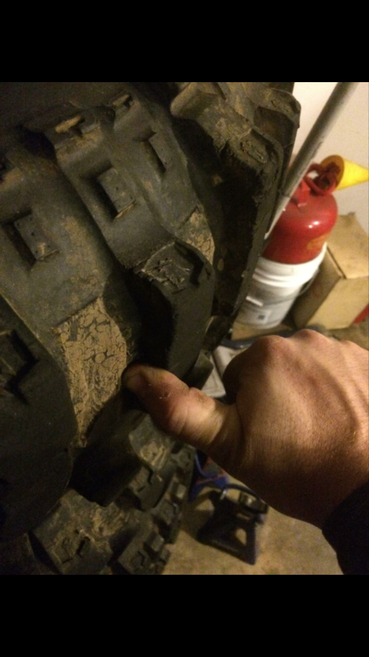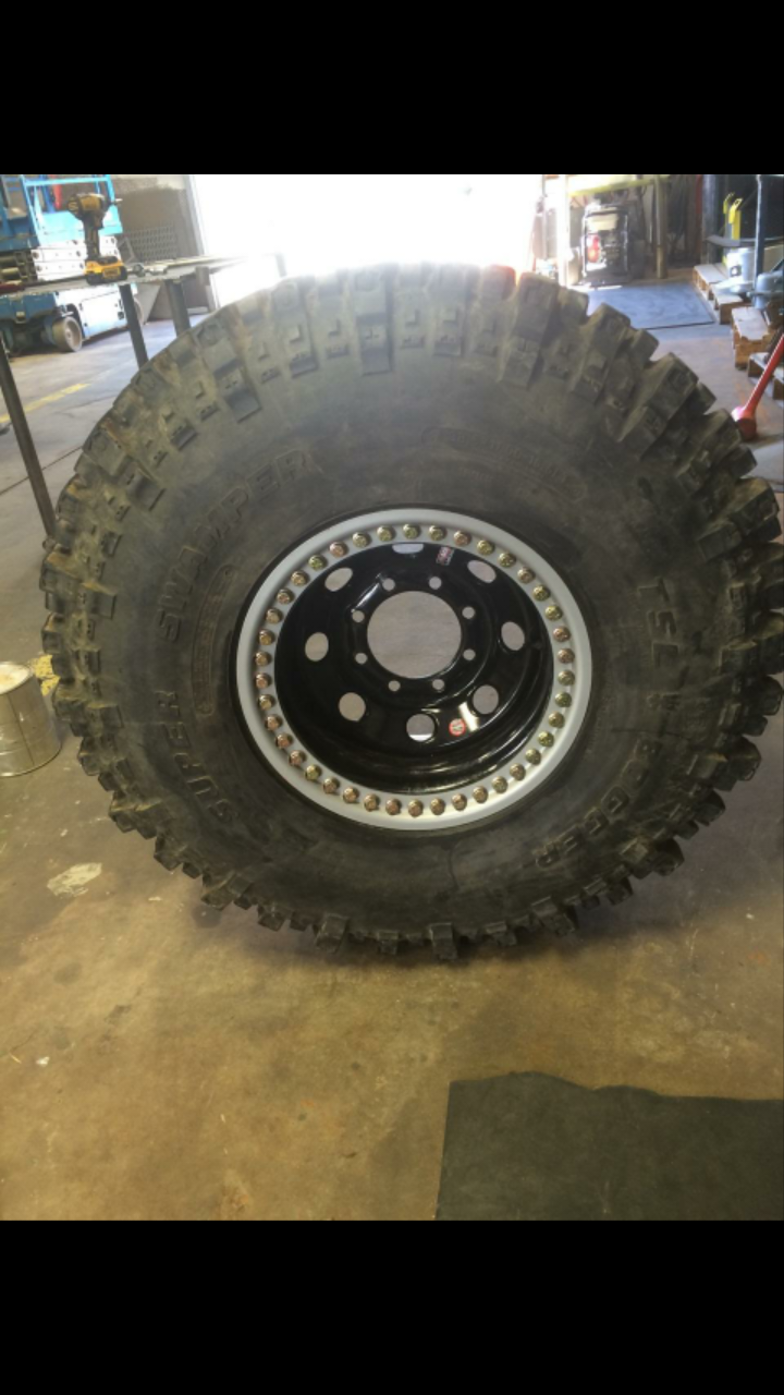 My buddy has 4- 8x6.5 mrw 32 bolt beadlocks mounted 38.5 x 11 x16.5 super swamper Boggers cut for mud racing. 80% to 90% tread