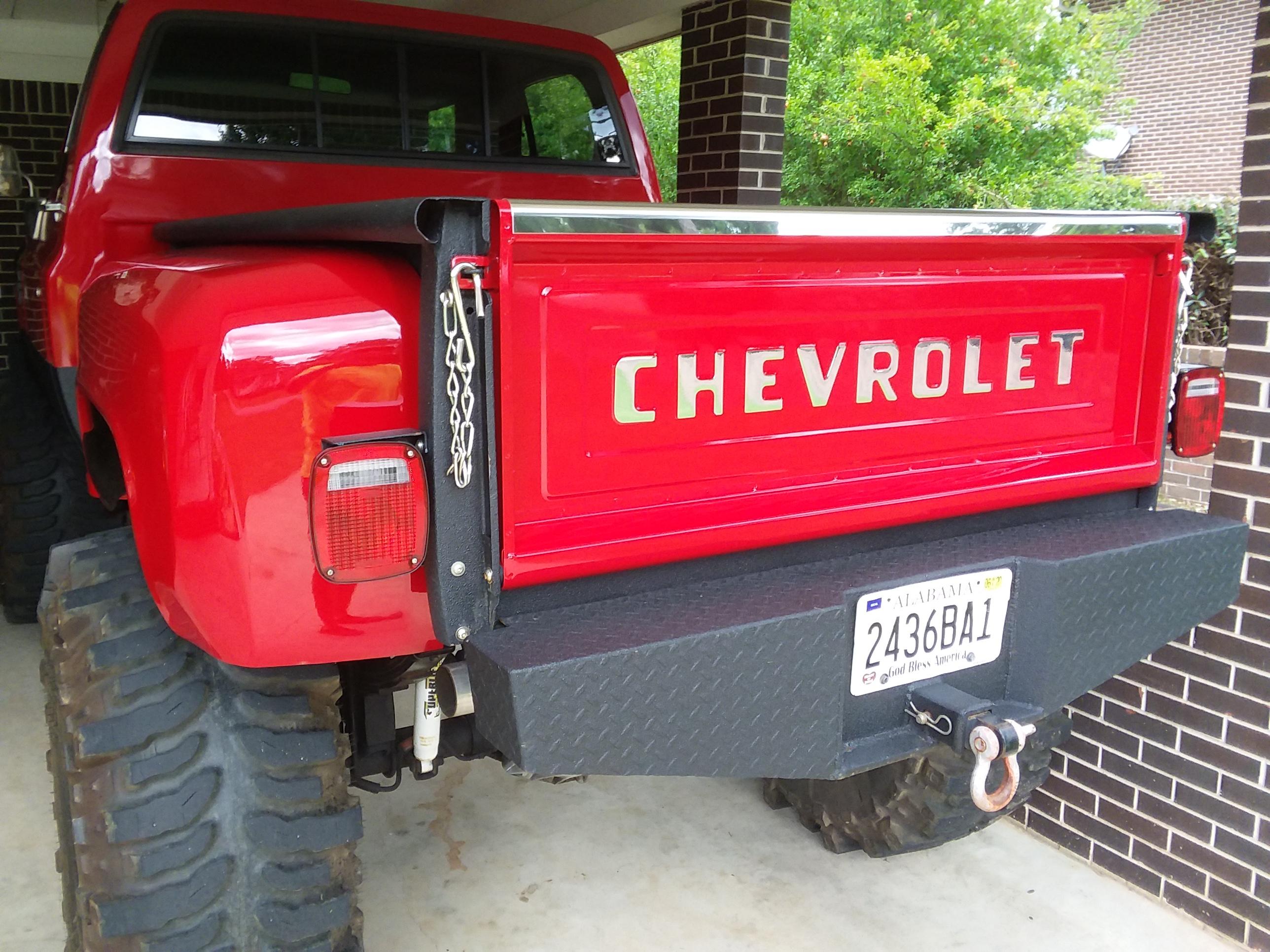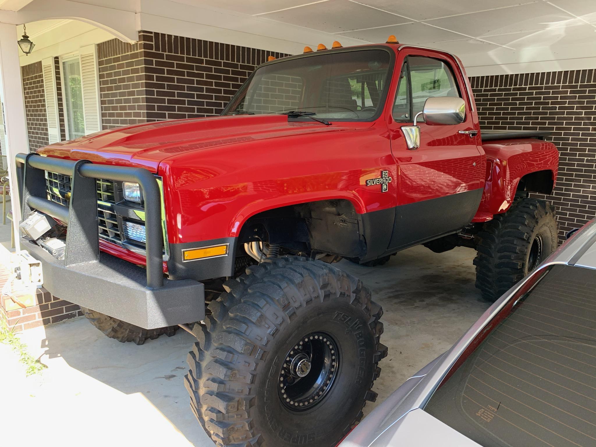 1986 Chevy 4x4,heavy duty bumpers 10k warn on front,12" lift,44"boggers on 15" beadlocks,Dana 60 front with 4.88 Detroit locker and 35 spline Yukon axles,14 bolt rear with disc 4.88 and Detroit locker,4 spd with 205,462 big block alluminum heads,roller cam,fairly peppy motor. The truck has no rust drivers floor has been patched,new paint,windshield,backglass,steel cowl hood,tailgate,all new lights,new wiring harness but needs wipers hooked up,no heat,has fuel cell in bed. The truck is basically a streetable mud truck but has decent street manners,could use interior refresh and has small leak from rear main seal. Asking $10k firm and no trades call or text if interested (205)294-5861 located in Clanton Al 35045