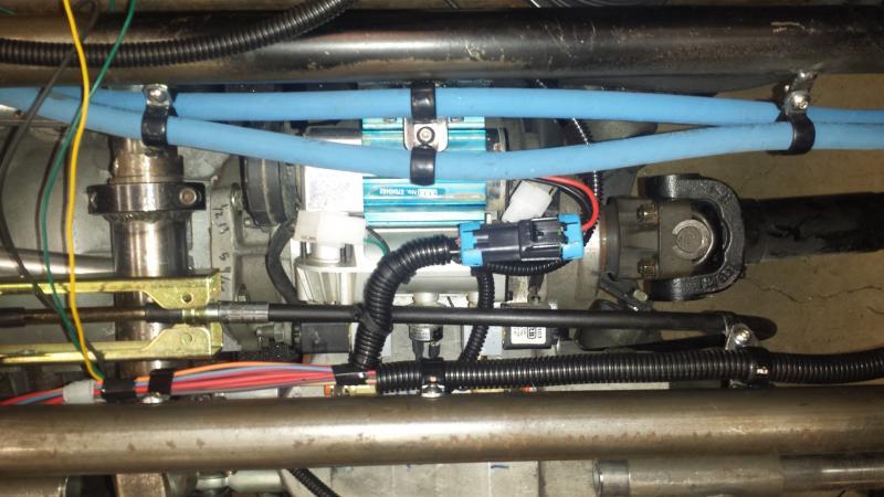 So this took some guess work and measuring to find a suitable location for the arb compressor. I had the mini and the normal to choose from and with lack of room I choose the smaller unit. After allot of thought I found the sweet spot for it down between the center chassis bars above the atlas. I had to redo a couple of the fuel line mounts and make a mount for the compressor and got it wired up.