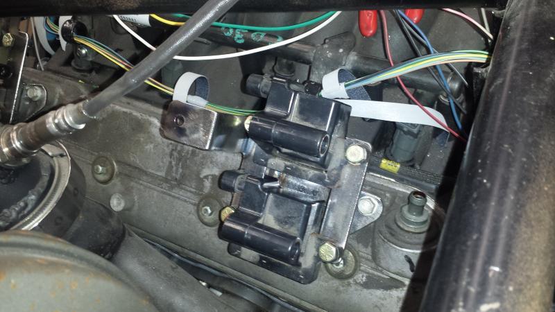 So before the wiring can get underway I had to resolve the driver side coil pack issue. Due to how the header is done the stock coil pack mount isn't even an option (I won't even say how it was mounted before