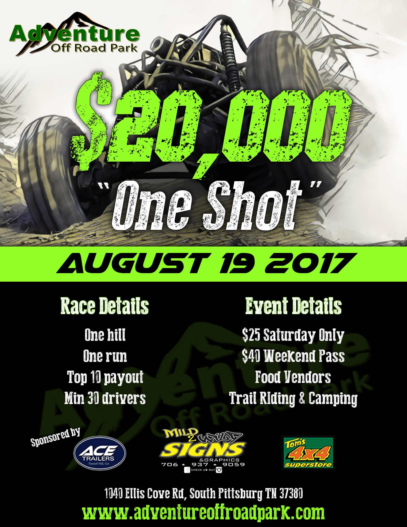 We are pleased to announce the $20,000.00 "ONE SHOT" run will be on Aug 19, 2017. The drivers will have to run a course that they cannot see prior to taking the start. The course will be challenging, doable, yet not brutal. The course will definitely display the driver's skill and his/her split second decision making. In addition, and most importantly, the drivers will have "One Shot" to make the top ten.