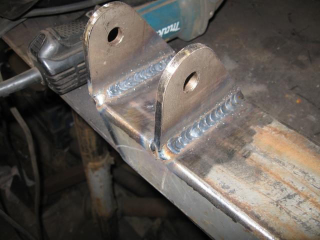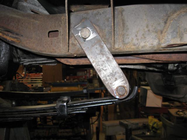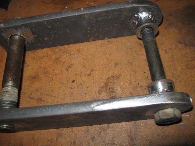 Needed some spacers on the bottom of the shackle to make the difference up between the upper bushings and the narrower rear spring used. I dug around and found GM cone washers to be the exact size needed, perfect. Welded them to the lower holes on the shackles.