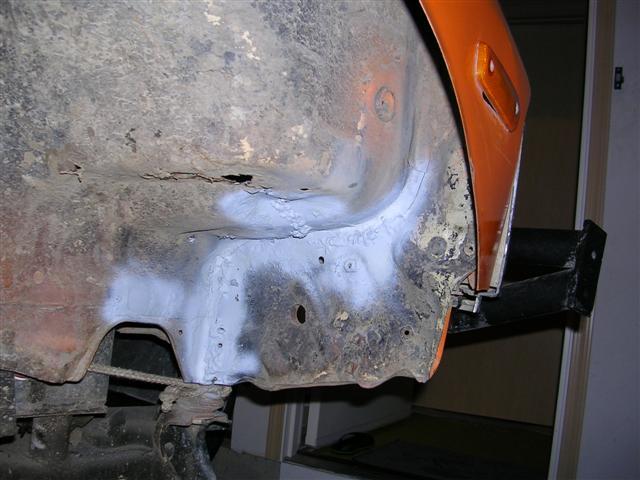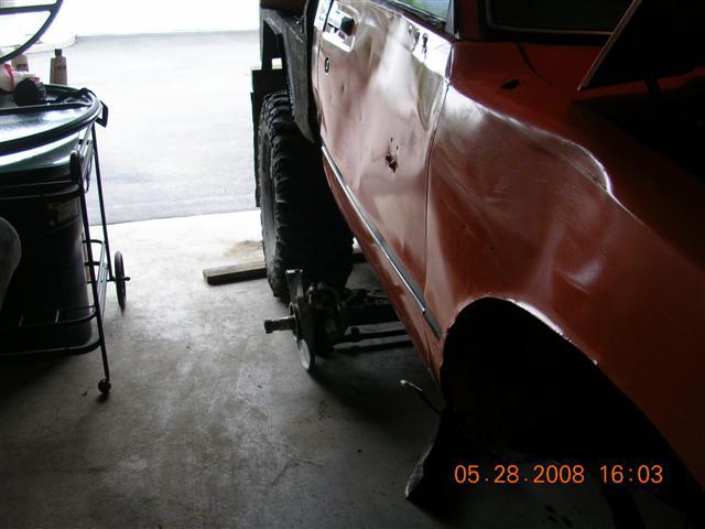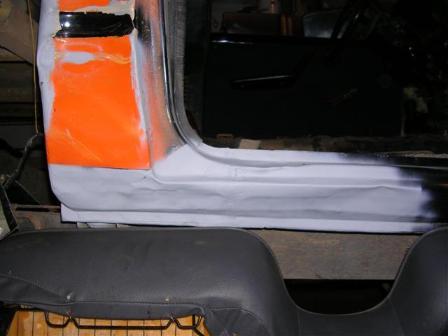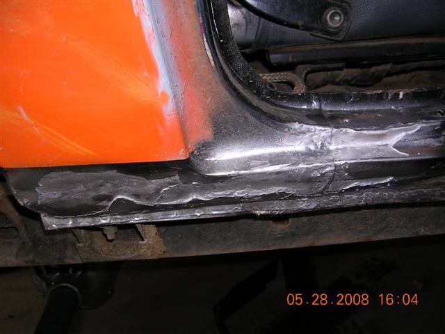 I later found my passenger side rocker was completly torn and then bondo slapped over it. So alittle welding and grinding got it back together:D I also found my passenger inner fender well to be completly torn off from the radiator support, so I welded it up and primered it!!!