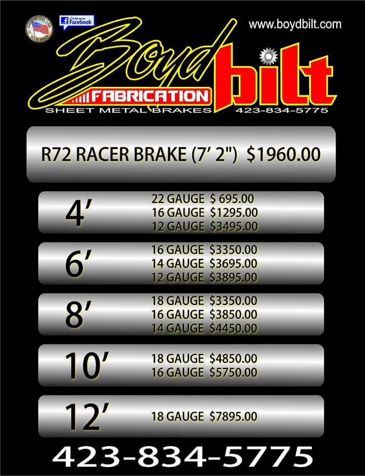 Pictured is a black 7'2" Racerbreak small red is a 4ft large red with black counter weights is an 8ft 16 gauge the unpainted one is a special 8'6" 16gauge for a customer and a price list with contact information and asking offering 10% off 8 ft 18 & 16 gauge breaks right now and if not in TN or GA no sells tax