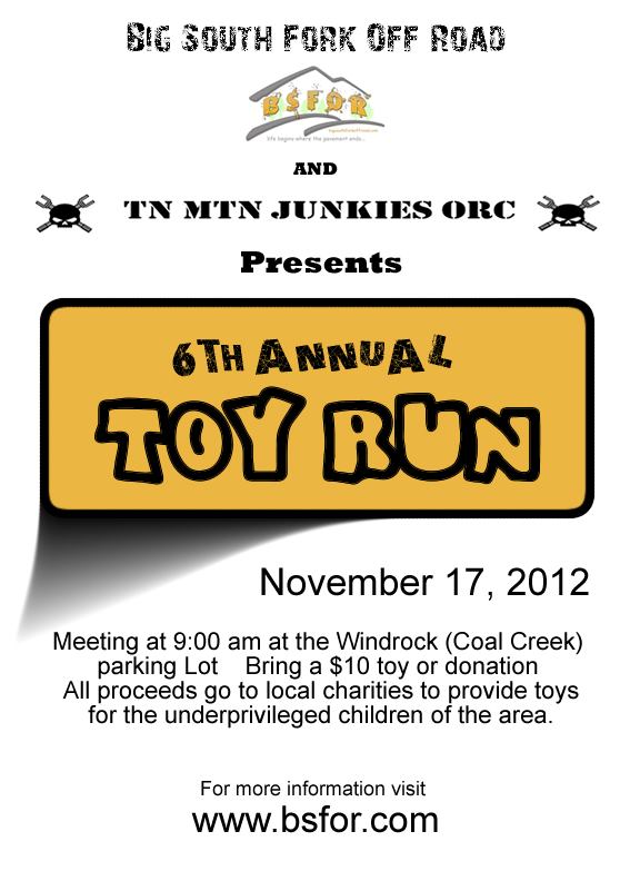 In cooperation with Coal Creek OHV Area, Big South Fork Off Road and TN MTN JUNKIES ORC will be hosting the "6th Annual Toy Run" Nov. 17, 2012 @ Windrock. Meeting at 9 am at the trail head parking lot pavilion. Bring a $10 toy or donation. Proceeds go to local charities to provide Christmas toys for underprivileged children of the area.