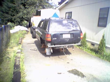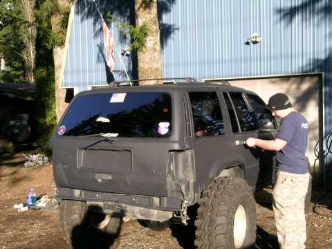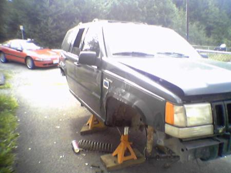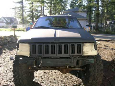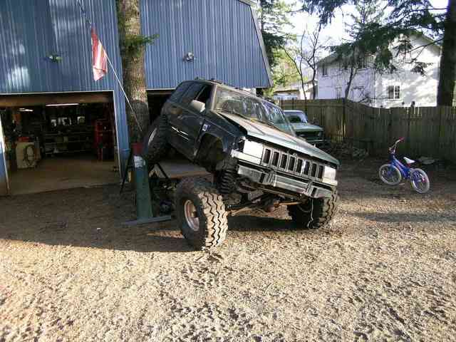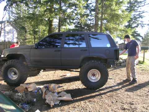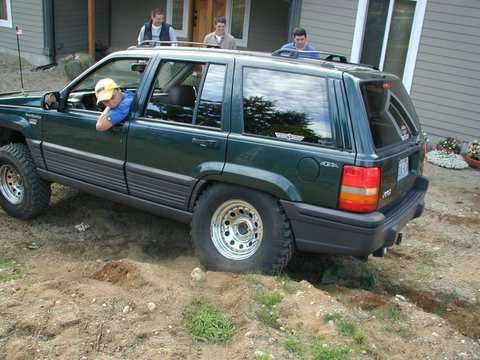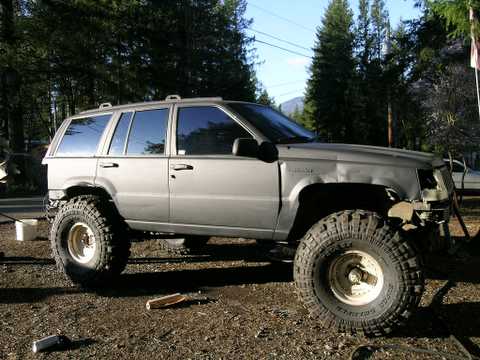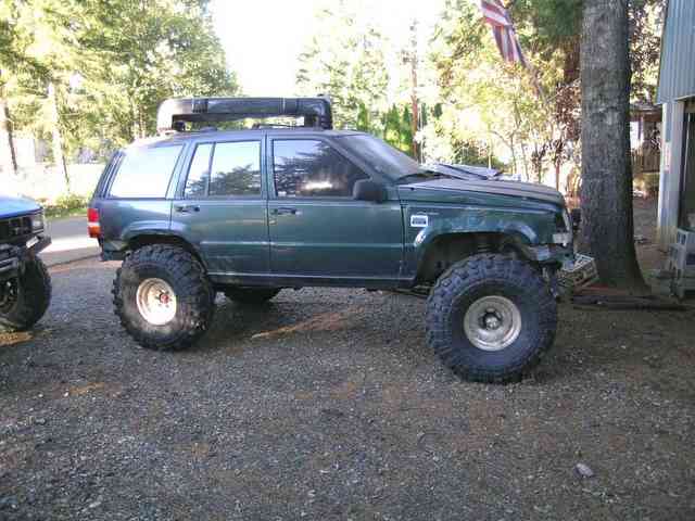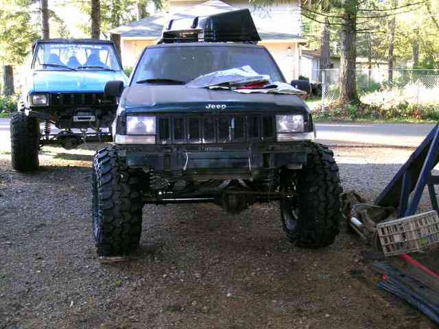 I got the rig junior year of HS (01), 1994 Grand Cherokee, leather, V-8, 68k miles, in damn neer perfect shape... It went thru some stages.... First, the SUPER hard core 2" BB spacer lift w/ some badass BFG 31x10.5 M/T's on some cool ass les schwab steel chrome POS wheels... (see first picture). Then came the RE 4.5" lift + my BB for my ultra rad 33x12.5 Xterrains i got when Lynnwood 4wp first opened. Got the T/R bumpers, some rock rails, blah blah blah, classic Jeepsunlimited ZJ build up. I started wheeling it, and it started getting some scratches and little dings, so I started getting used to it not being the "pretty" Jeep it was when I had got it.... Then driving down Aurora one day (right in front of Sarg's carlot actually :flipoff: ), the D35c blew the hell up. So then came the 8.8/hp30 swap every dumbass with one of these things does. 4.10 gears, minispool in the back, lockwrong up front, the "big" 297 shafts up front. Then I came up with the really good idea of getting some 35x12.5 MT/R's....yeah, locked up D30's don't like 35's, and a V8.