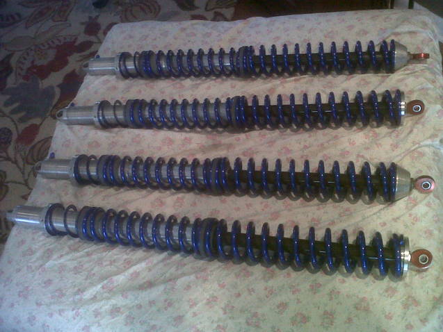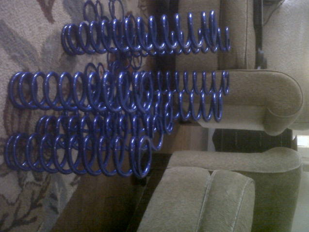 Got the springs for the 16" TK1 coilovers back from the powder coater's today. They are QA1 coils 150/200 spring rates. They were pretty rusty and just plain crusty.. I assembled them in the living room, It's starting to get muggy in the garage here in FL. Going to have the same company possibly powder coat the chassis when I'm ready in a hammered typed finish..time and money will tell :dunno: Anyways on to the pics