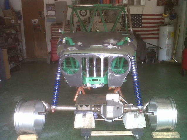 I would be a bit concerned with that truss/steering mount on the axle. You would be hard pressed to have decent ride height and uptravel with that thing on there. I can get you some pictures of how it was on mine...but the axle and chassis were designed so the axle would go up into the chassis right there. there was no truss on top of mine. The steering went in front of the axle (on a long tube bent around the front). The upper link mounts BARELY went up inside the chassis in the front. It sat pretty damn low and had about 6 inches up before full bump.
