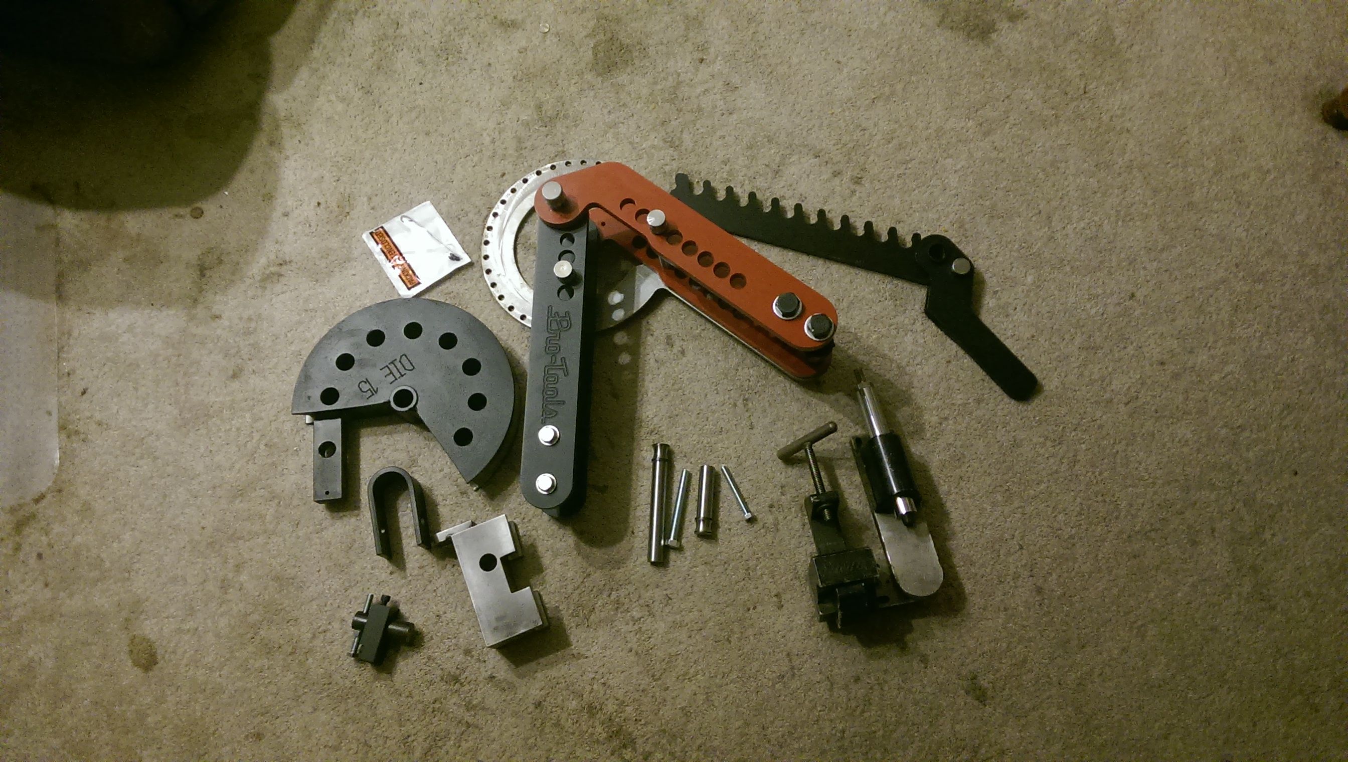 Here's kind of an overall view. The "CUBE" in the pic is THE most valuable piece of equipment. We use a POB bracket some times but most of the time you can get by with just the cube. We have also upgraded to the SWAG U-turn digital read out but I'm still having mixed reviews on it right now. I don't know how it possibly turned out the way it did but at full bend ours ends up at EXACTLY 90.0 degrees before re-pinning.