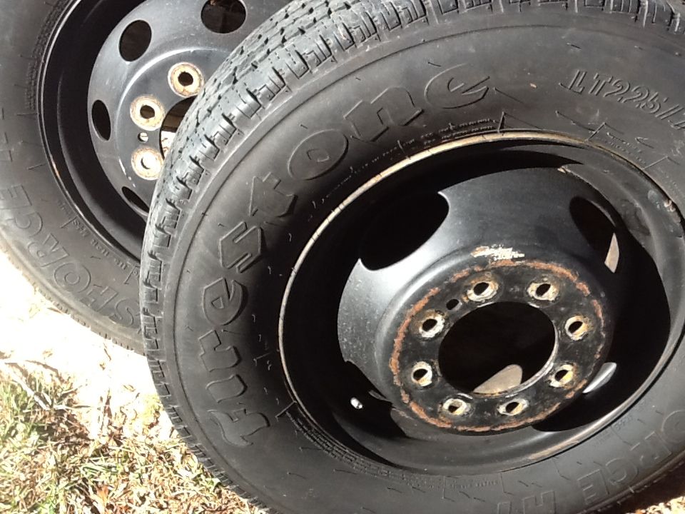I bought two wheels and tires for my 99 F350 tow rig off CL. They were listed as being off a 2003. I thought 99- 05 would fit but these will not fit. They will hang on the studs but will not go on. I would like to trade for two wheels that will fit my rig with or without tires. These tires have many miles left, no cracks or anything appears to be wrong with either but one has lost some air since I got them in December. Tires are LT 225/75 R16. Need dully rims in 16", I have new tire in the size I need. 850-547-5503 or will sell for $150, that is what I gave.