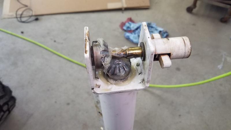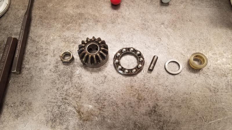 So next you gotta remove the driven gear. On the center there is a nut, remove it and then the gear and a pin(it should just slip out). Then remove the bearing, washer and nylon shouldered bushing. Pay close attention to the nut as it will be important on re-assembly.