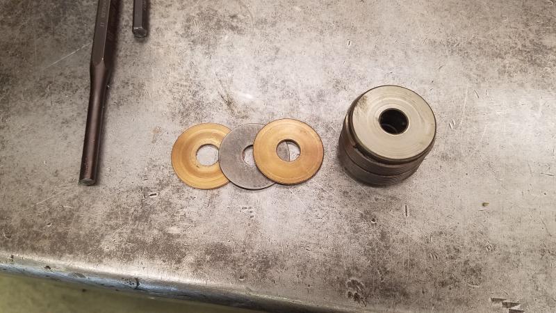 The next part is tricky to get it apart easily. Holding the bottom of the jack set it on the ground upright(don't let it separate). Holding the bottom with your foot lift the outer portion up about 1/2" and grab a 90 degree pick. Inside the jack at the top there are 3 washers and a spring head. You want to make sure the washers don't stick to the outer body by using the pick and then lift it apart. You can see how it sits on top of the threaded shaft. Pull it off once its out and clean them. You can see how they are situated with copper, metal and copper.
