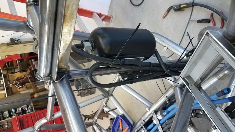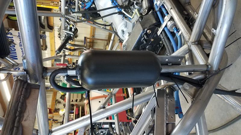 So the vents run up to behind the passenger rear panel and I made a mount for the catch can for the tranny vent. It has a shut off valve in case of a roll over to help from loosing badly needed fluid...
