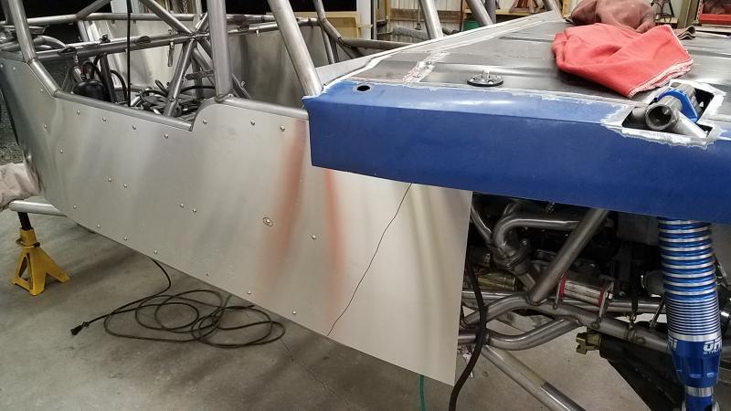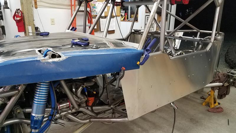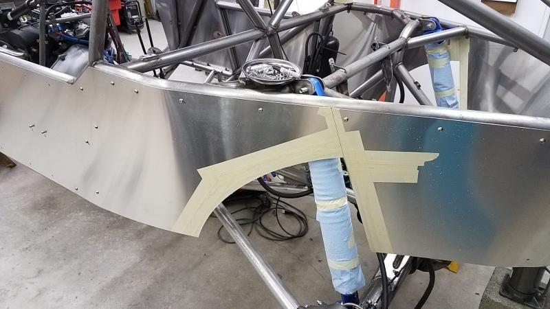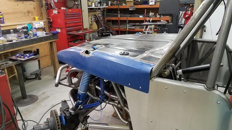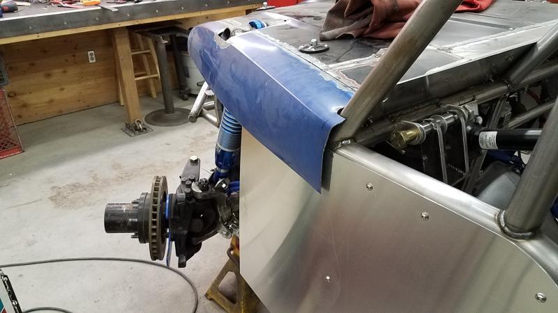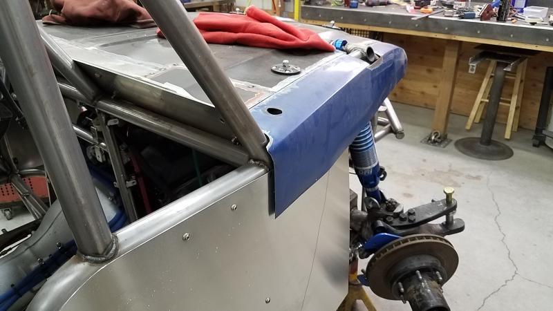 So started by angling the panel inward to match the hood and cut the panel. Added one tab at the bottom and a long plate behind where the panel/hood overlap to suck the hood to the panel. I plan on using some Dzus fasteners and made the plate behind wide enough. It certainly looks much better and I think once the hood/body panels are the same color it won't stand out quite as much.