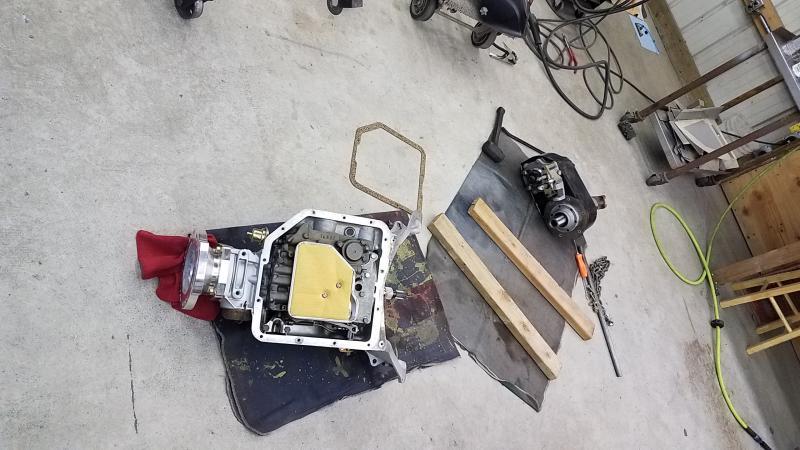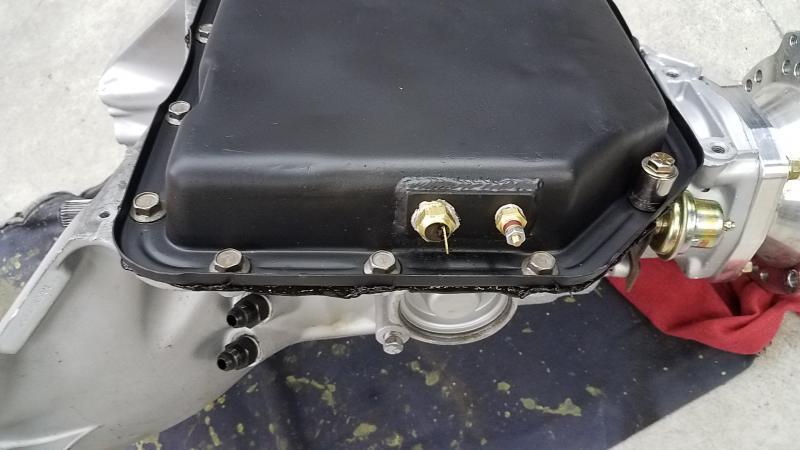 Was time to get the tranny/t-case finalized and ready. Separated them to not only made it easier to work with but I had not sealed the one side of the adapter. Pulled the pan so I could make a bung plate for the 2 sensors(temp gauge and fan control) I needed in the pan. I originally planned on them on the back side of the pan but didn't realize there was not enough depth due to the valve body. So I opted for my second choice. I also used pan sealant we use on the newer dodge's with no pan gasket...