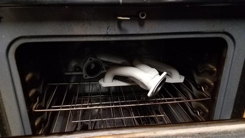 So I decided to try this VHT exhaust paint that has to be backed on. I am glad my wife loves me--the smell actually want that bad... So the headers are done and had my oven been bigger I would have tried to make my y-pipe fit...