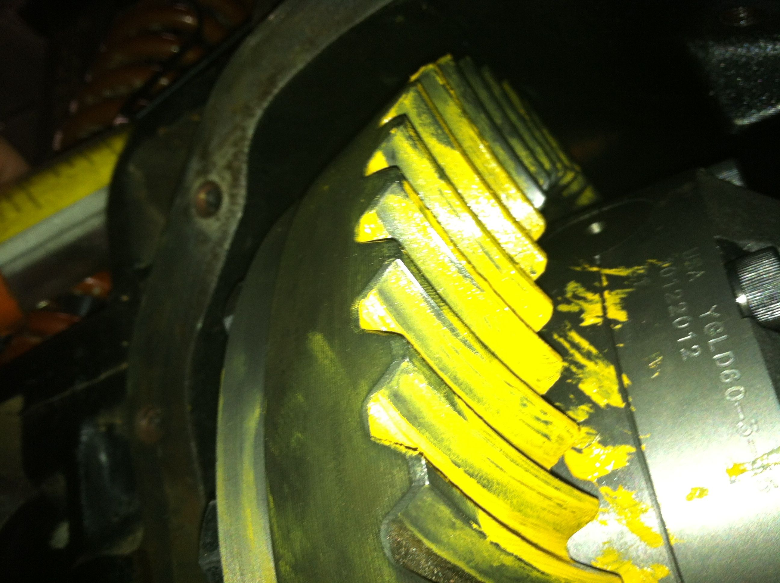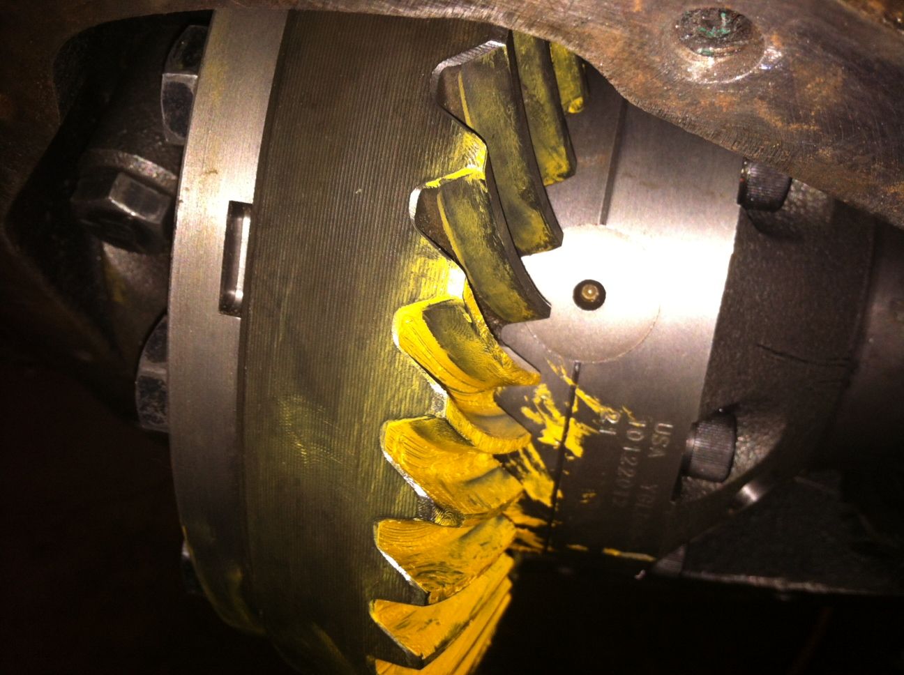 Looking for a little help. I took a couple of pics to see what my problem is. Background is I ran this front D60 for 4 years with stock welded 4.10's in it an never broke a ring gear. I changed to 5.13's and have broken two ring gears in two trips. This time I bought a Grizzly and Dana Spicer gears. So, Ive fought this setup for three solid nights now and can't get a good pattern. It's hard to get a good pattern by myself but I think you can still see in the pics my drive side is deep into the toe and the coast is on the heel. Pinion depth seems pretty good. Everything I read says decrease backlash. I started out trying to keep around .006 but am now at .003 or even less. I have changed pinion depth several times going both directions and nothing seems to be changing this problem short of taking out all backlash. Any ideas?????