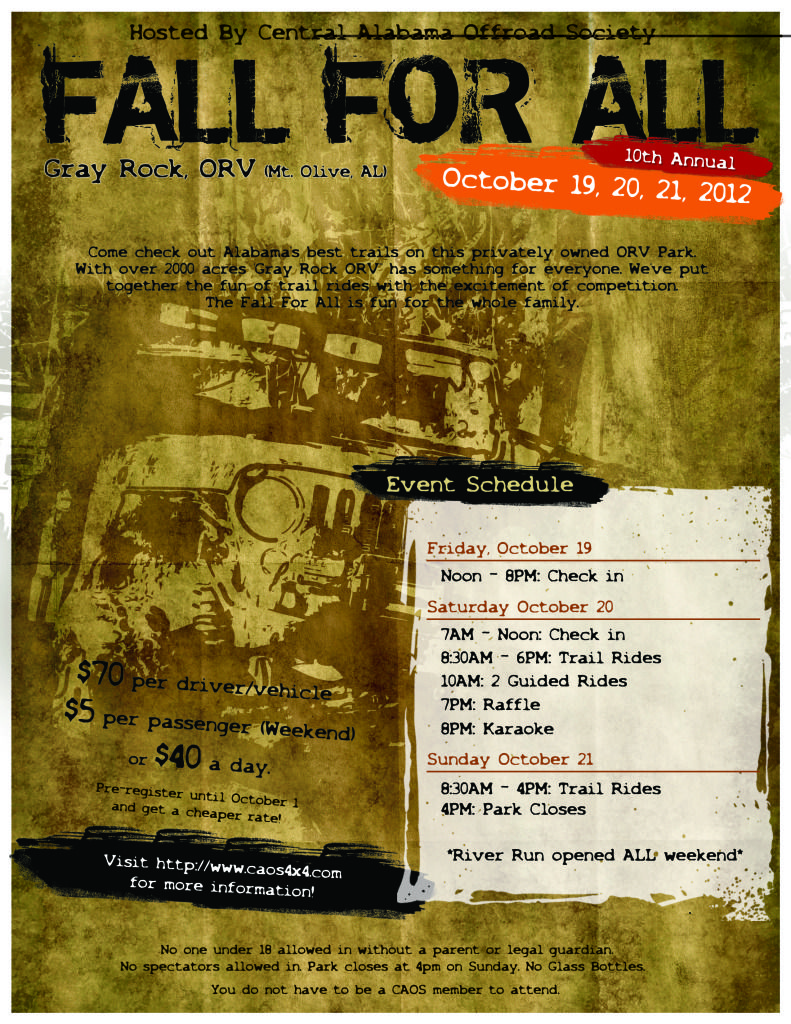 Come check out Alabama's best trails on this privately owned ORV Park. With over 2000 acres "Gray Rock ORV" has something for everyone. We've put together the fun of trail rides, the excitement of a raffle, the laughs of karaoke, with great Southern hospitality. The Fall For All is fun for the whole family!