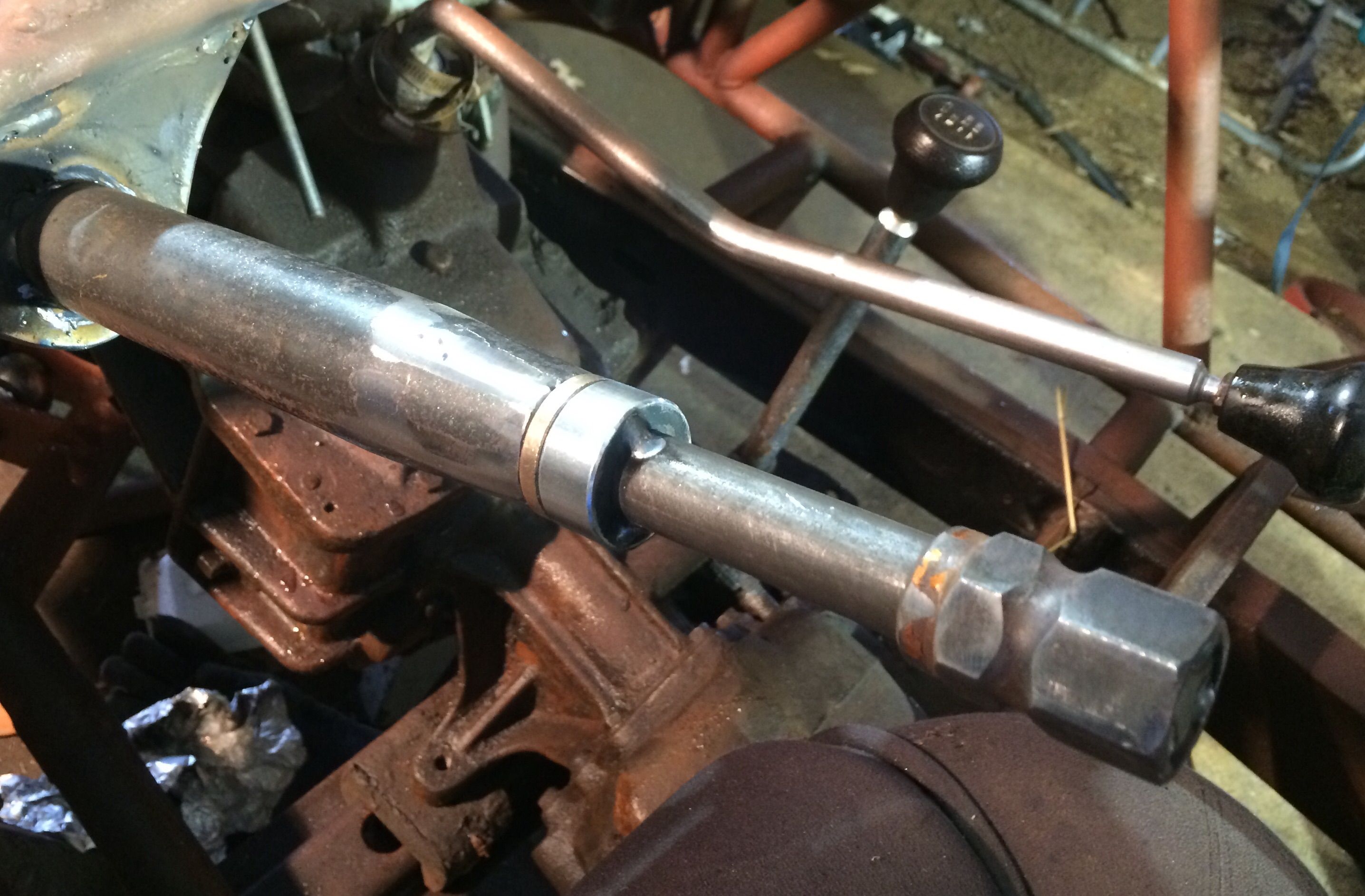 My steering column is 1.5 tube with a 3/4 shaft inside. Apparently, they don't make a bushing to go 3/4 to 1.25. So I improvised.