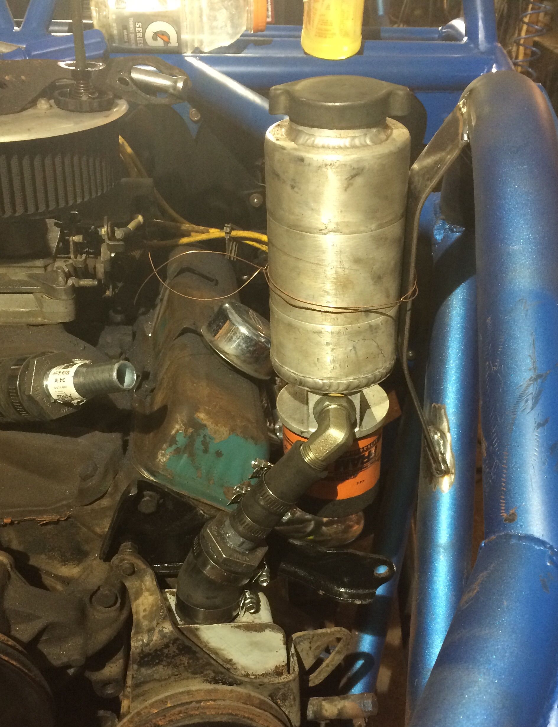 So I have this power steering reservoir I've been wanting to use but have a stock pump and don't want to replace a working pump. So I had an ideal to drain res into top of pump. I had to come up with a simple mount. I'm happy with it should have plenty of capacity.
