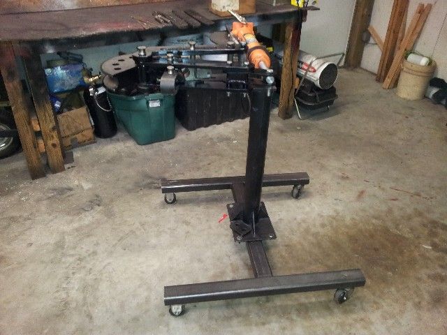"top" swing arm which is used for bending the tube is modified to withstand thickwall tubing. The top arm has had an extra plate welded to the trailing edge of the arm, the loaded side of the arm, and the two holes on each side have been plugged providing for a much stronger arm. However, I have the original top arm that came with the bender should you need to change to it for a different size die with a much smaller radius or you simply want to use it. On thedie, the tab that the tubing clamp attaches to has been gusseted and will NOT break OFF. As you will see in the pictures the bender has been converted over to air over hydraulic using the 8 ton harbor tool and frieght air cylinder. Also, the bender is on a rolling stand and the stand which can easily be seperated from the the rolling base and mounted to the floor if you shoud desire. I have everything to convert it back to a manual bender if you like. I have had this bender for about 4 years and it is in good shape.
