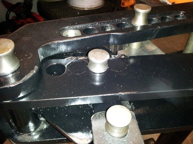 The last picture is of a the original top swing arm. The second to last picture shows the thicker main arms,gusseted tube clamp tab on die, and the modified top swing arm for bending thicker tubing. To swap the top swing arm out is a matter of unbolting two bolts.