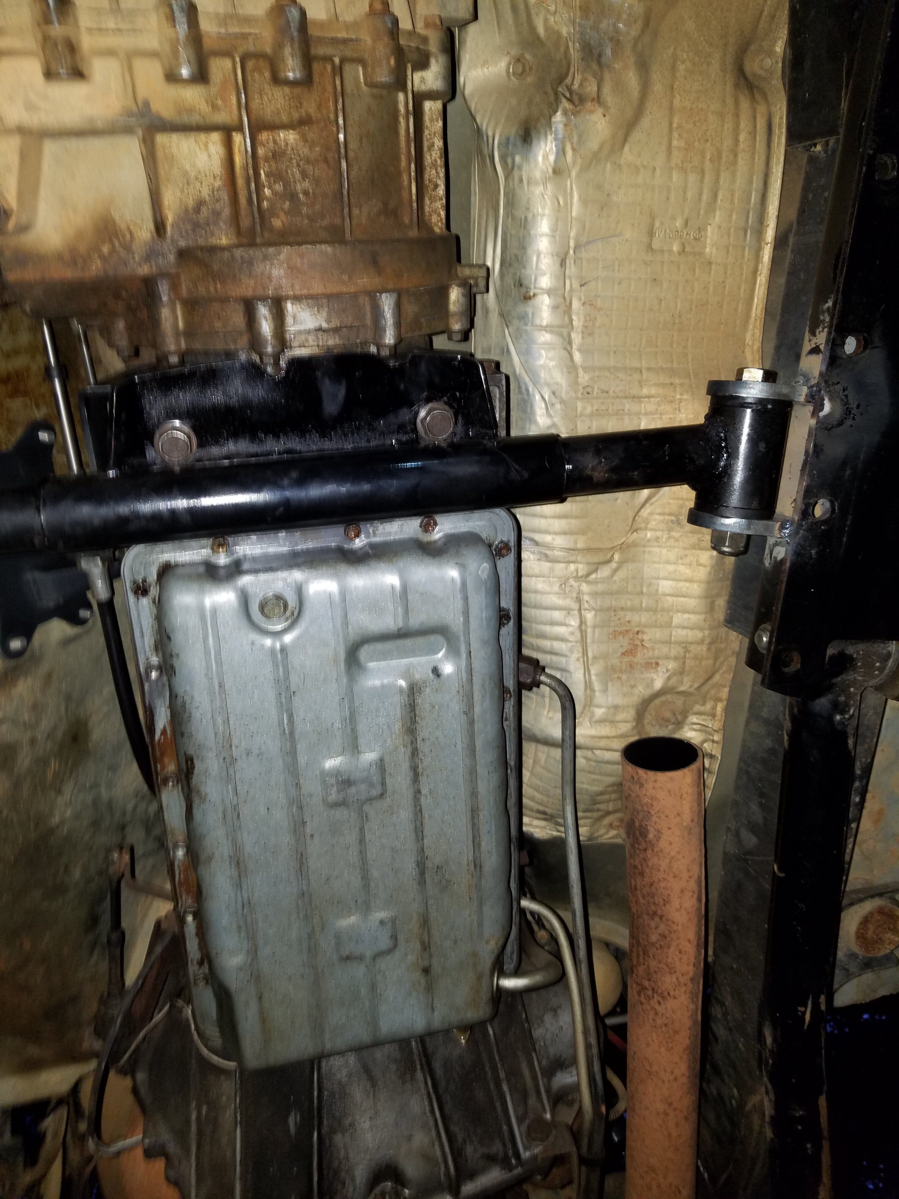 Swapped in an AW4, TCM and shifter out of and XJ. Reclocked the tcase by drilling a new set of hole in the aw4 trail shaft. Had to buy the crazy balancer to move the CPS to the front. Put together a cross member mount for the transmission so I can drop the belly pan without having to support the trans and tcase with a jack.