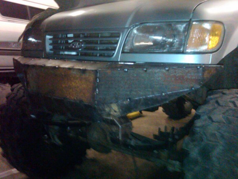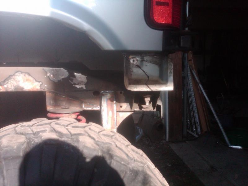 I got after it today it was so nice I pushed it outside to work on it :awesomework: I knew there was gonna be some serious rubbing so I didnt want to build a bumper and have to change it later on so I flexed it out and made a sweet cardboard bumper flexed it again and it all cleared so I started cutting some steel. I got it all tacked up on the outside and welded inside where I knew I wouldnt be able to get to once on the truck. I trimmed the fender a little bit It should be good to go with about 6 hours of welding and grinding. :D