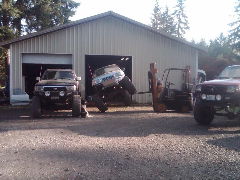 Well I have been tying up a few of the loose ends on this thing the last couple of days and for those who noticed the upper link seperation at the frame. I fixed that :awesomework:. I took it outside for a bath. and got the shop cleaned up (long overdue) and me and my bro got an engine dropped in his tow rig. here is kind of a before and after pic even though the bumpers arent on it. and our ride to KOH next year :cool: