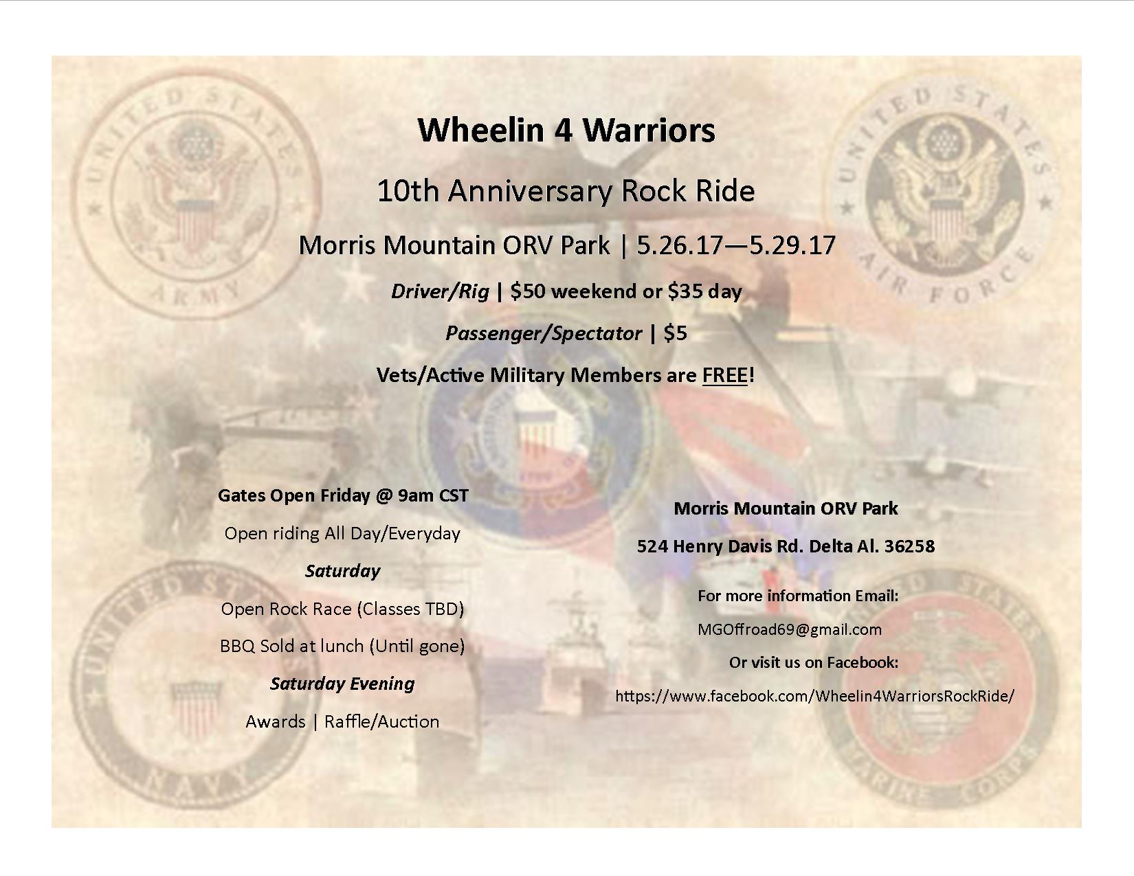Now that you are settled into the new year, its time to make plans for your big trips this year. This year marks the 10th anniversary of the Wheelin' 4 Warriors Rock Ride at Morris Mountain Offroad Park and promises to the biggest the yet. Since the first ride, the only goal of the event has been to honor veterans and raise money to aid the wounded among them. Every year, 100% of all monies raised through donations, ticket sales, raffles, auctions or any other means to include park entrance fees has been donated to the cause. The clubs and individuals behind the event are all volunteers and do not receive anything but satisfaction for job well done for their efforts. This year's event will again be over Memorial Day weekend (May 26-28) like it has been for the last 9 years.