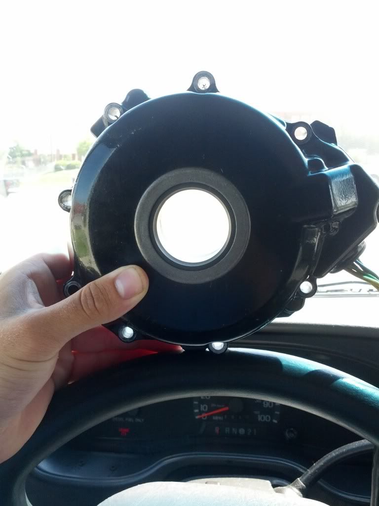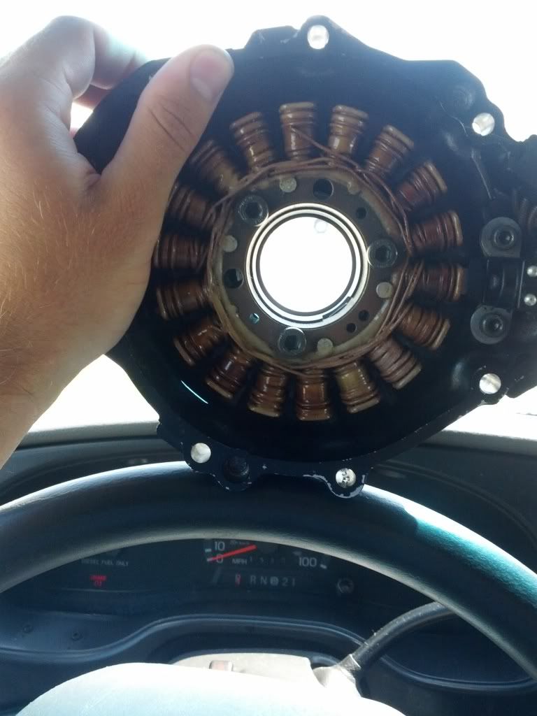 To get a pulley on the motor we took the stator ( basically a built in alternator for those of you who don't know what that is ) and took it to a machine shop and had them cut a hole in the case cover and weld a bar on the plate that would slide through a press fit seal on the cover to mount the pulley to. This goes directly to the crank so the RPM doesn't change with the gears. Whatever the tach sais is what it is spinning.