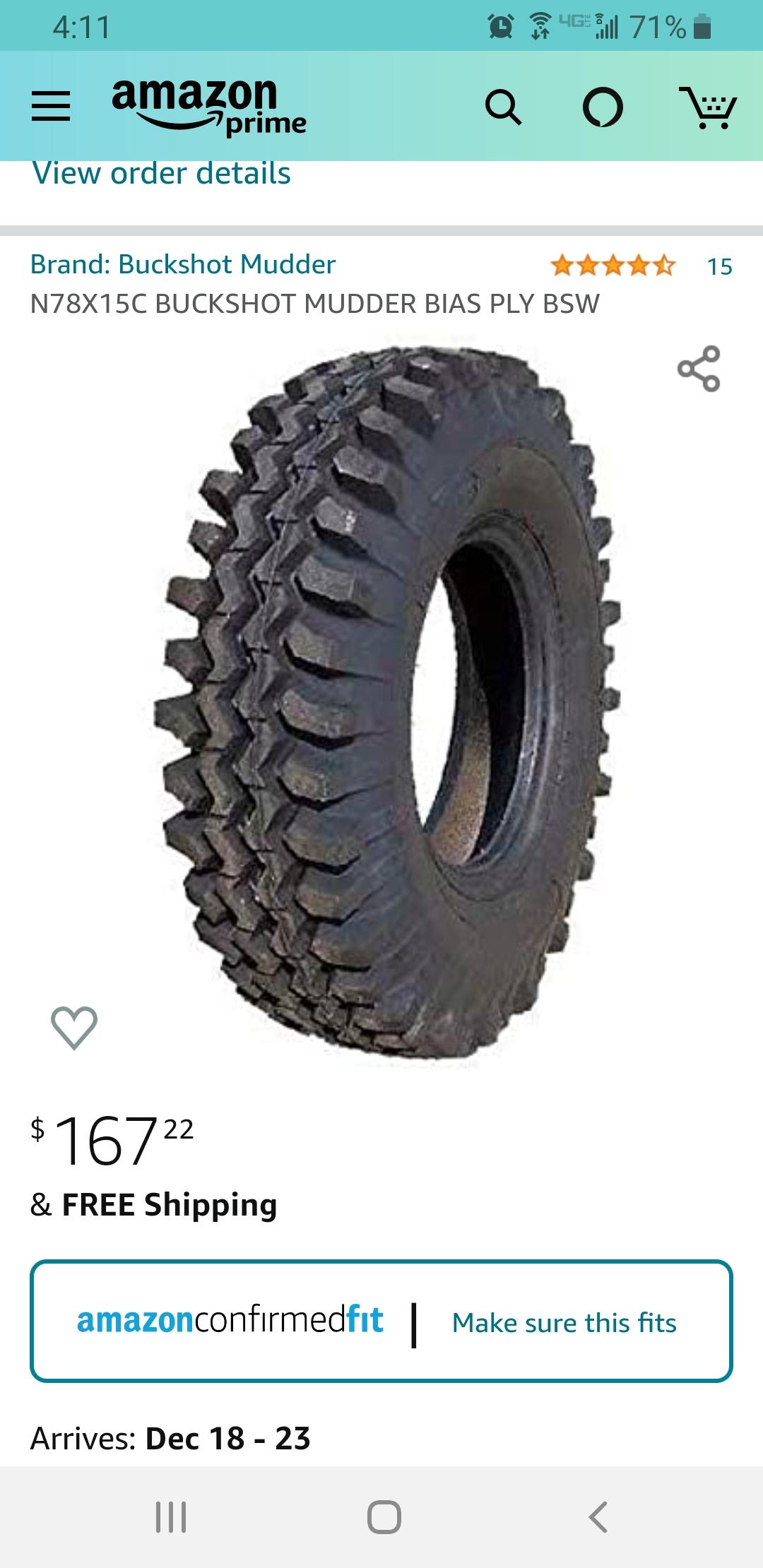 2 nearly new N78-15 buckshots with maybe 500 miles on them . They are flawless. I gave 300 for them . Asking 225 obo for the pair . Buy two more off Amazon and have a full set .