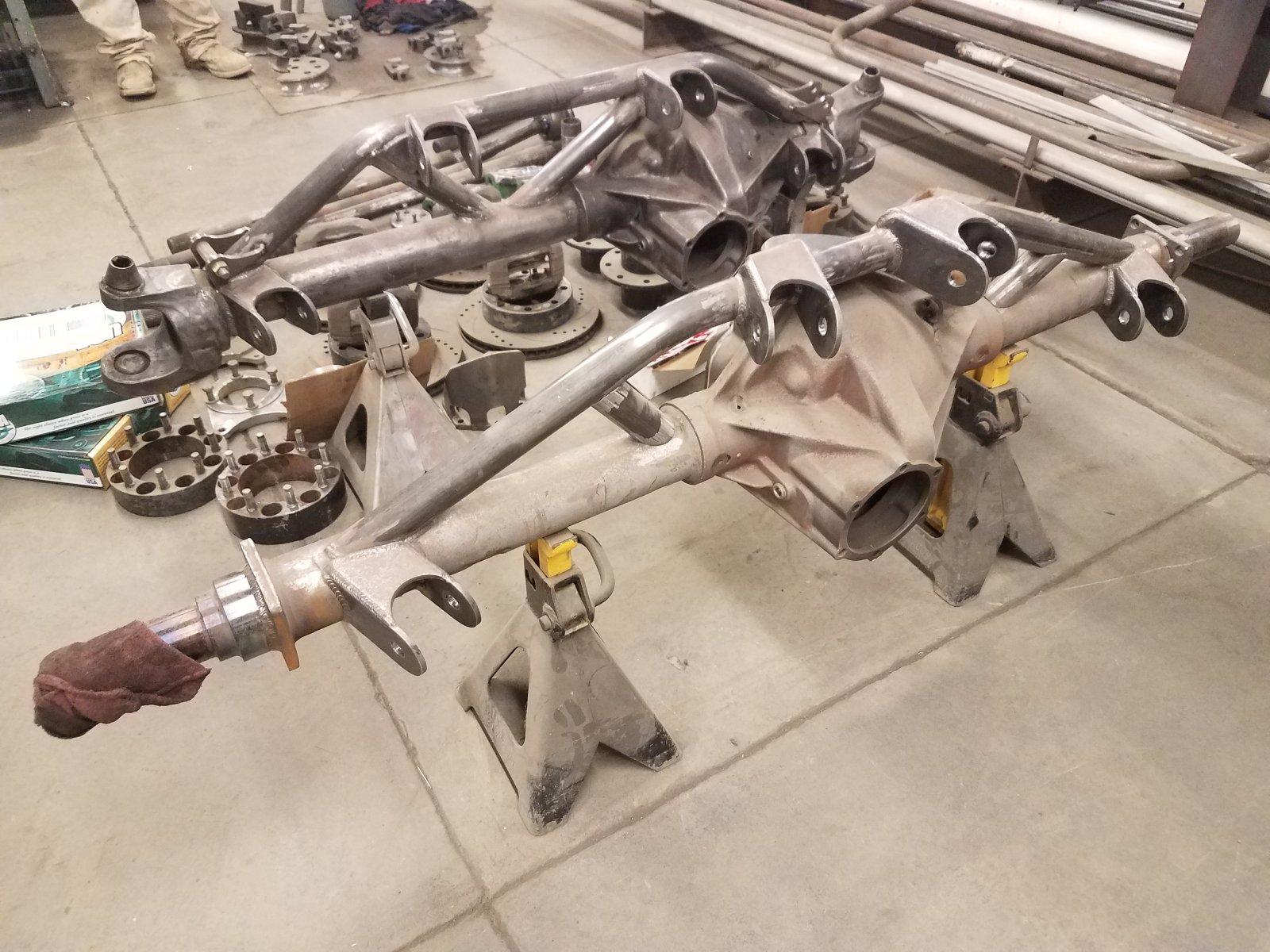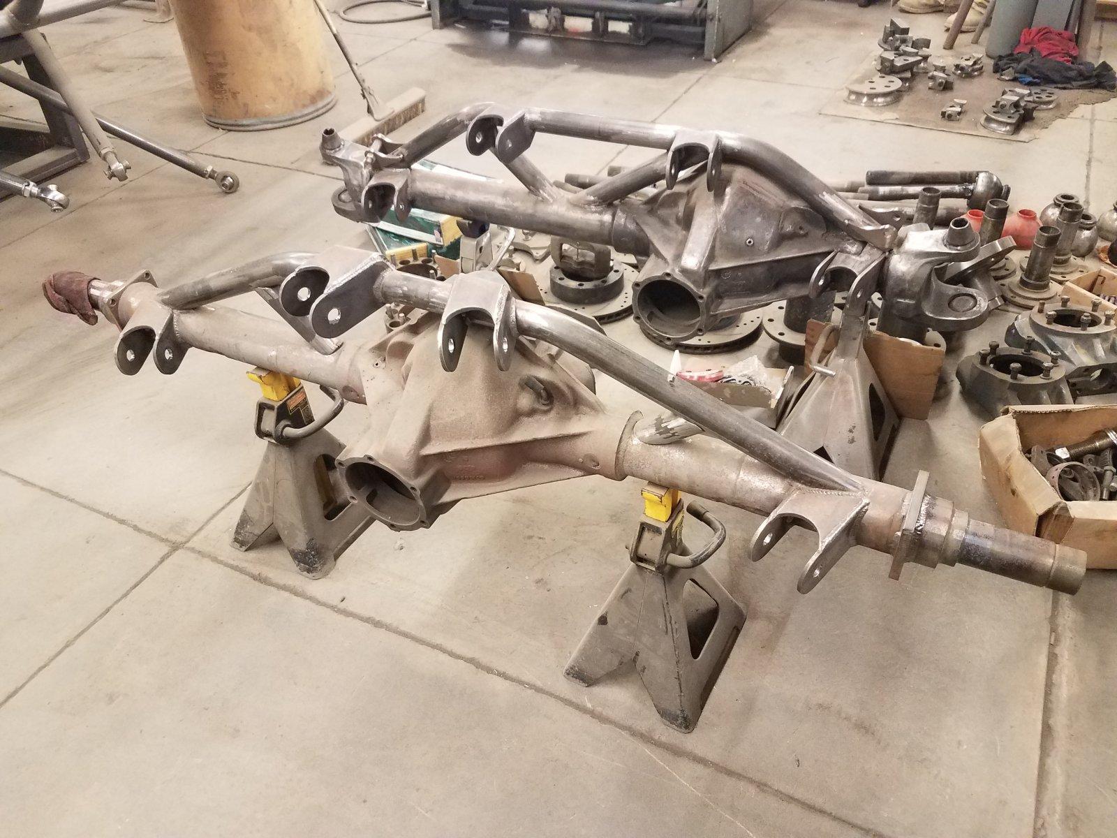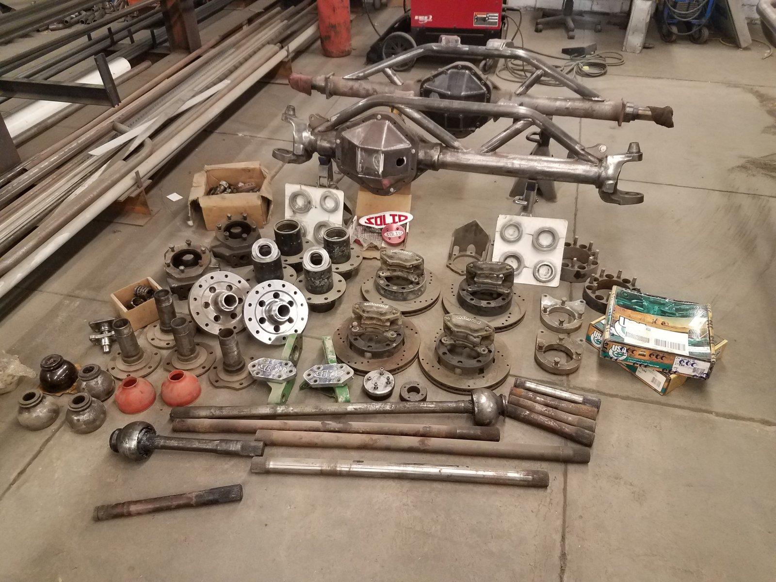 Here is the original "Plowboy" Axle set up. Everything is here to have complete running axles, with the exception of Ring & Pinions. The front housing is original. The truss was cut off and reworked. The rear axle housing is not from the original build, as it has been replaced and trussed along with new spindles. Been a while since I was involved with this project but I'll do my best to describe and list what is all here. Everything you see in photos goes (welder and steel excluded). If I leave anything unanswered, such as technical specs, please feel free to reach out. I can take any additional photos or pull dimensions as requested.