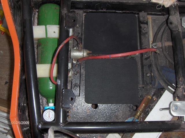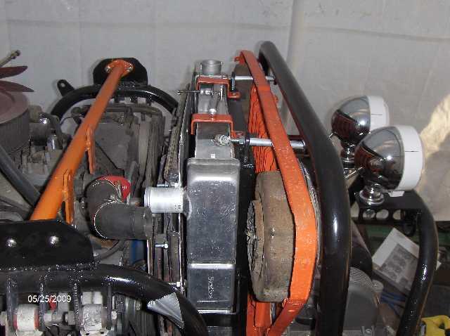 Finished up the radiator and fan mount. Got a full 1/2" of clearance to the compressor now:redneck: Wound up tieing it to the nose bar for the upper mount. Found some alum, tube that fit over the 3/8" bolts and then drilled some 1" holes in the grill for grommets so the grill has a little movement from the frame. Got the batterys mounted under the passenger seat along with the air tank. Was a little worried about have the batterys on their side on the floor (rubbing) so I found a great use for a couple of old mouse pads:haha: The winch syl, is for tieing the batterys together for charging and when that extra grunt when needed for long pulls. Even got the starter syl, mounted. Bunch of other small things but they all need to be done:booo: