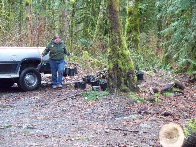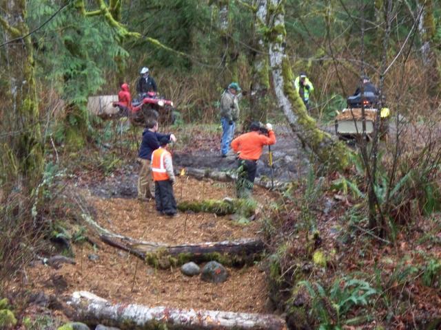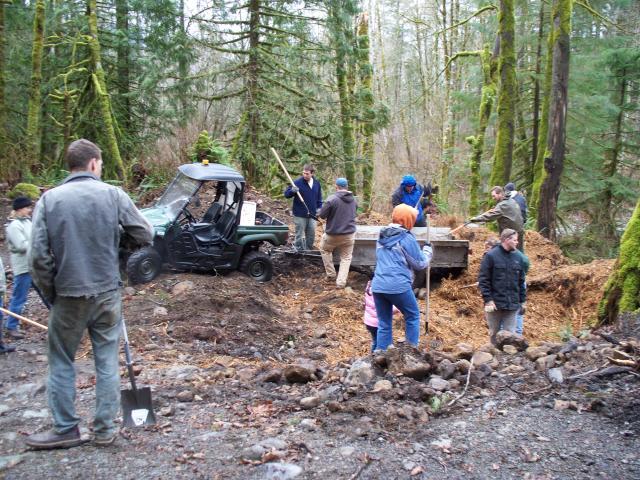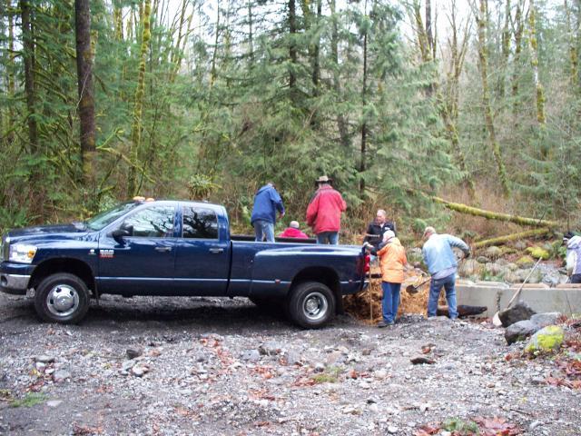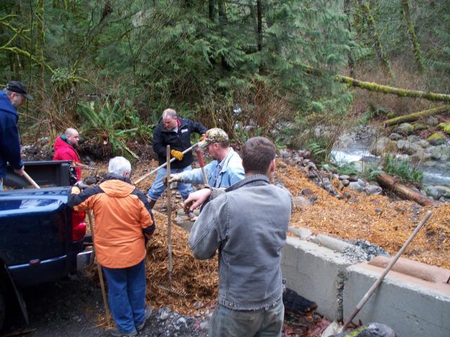 Al great deal was accomplished by a lot of hard workers on both sides of May Creek at the two crossings and new plants were also planted at those sites. Other trails along the road back to the crossings were blocked and restoration materials put into place.