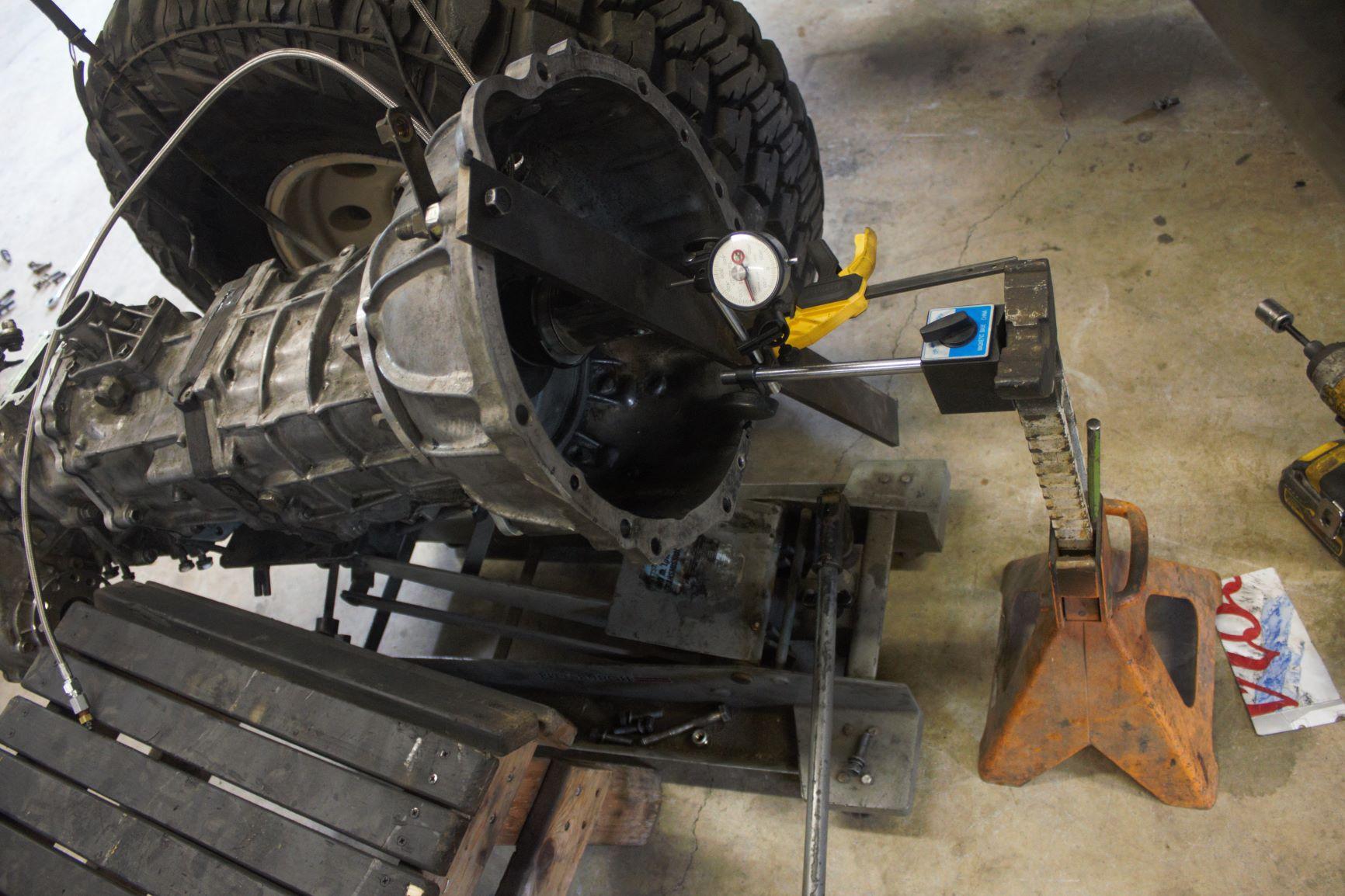 IMG_7246.jpg after installing the motor and trans and hooking up/bleeding the clutch, i still couldnt feel any clutch disengagement. (pedal depressed while trying to turn tcase output with breaker bar) So I took the trans back out, hooked up the slave, bled it again and clamped a piece of flatbar across the bellhousing so I could check the throw...
