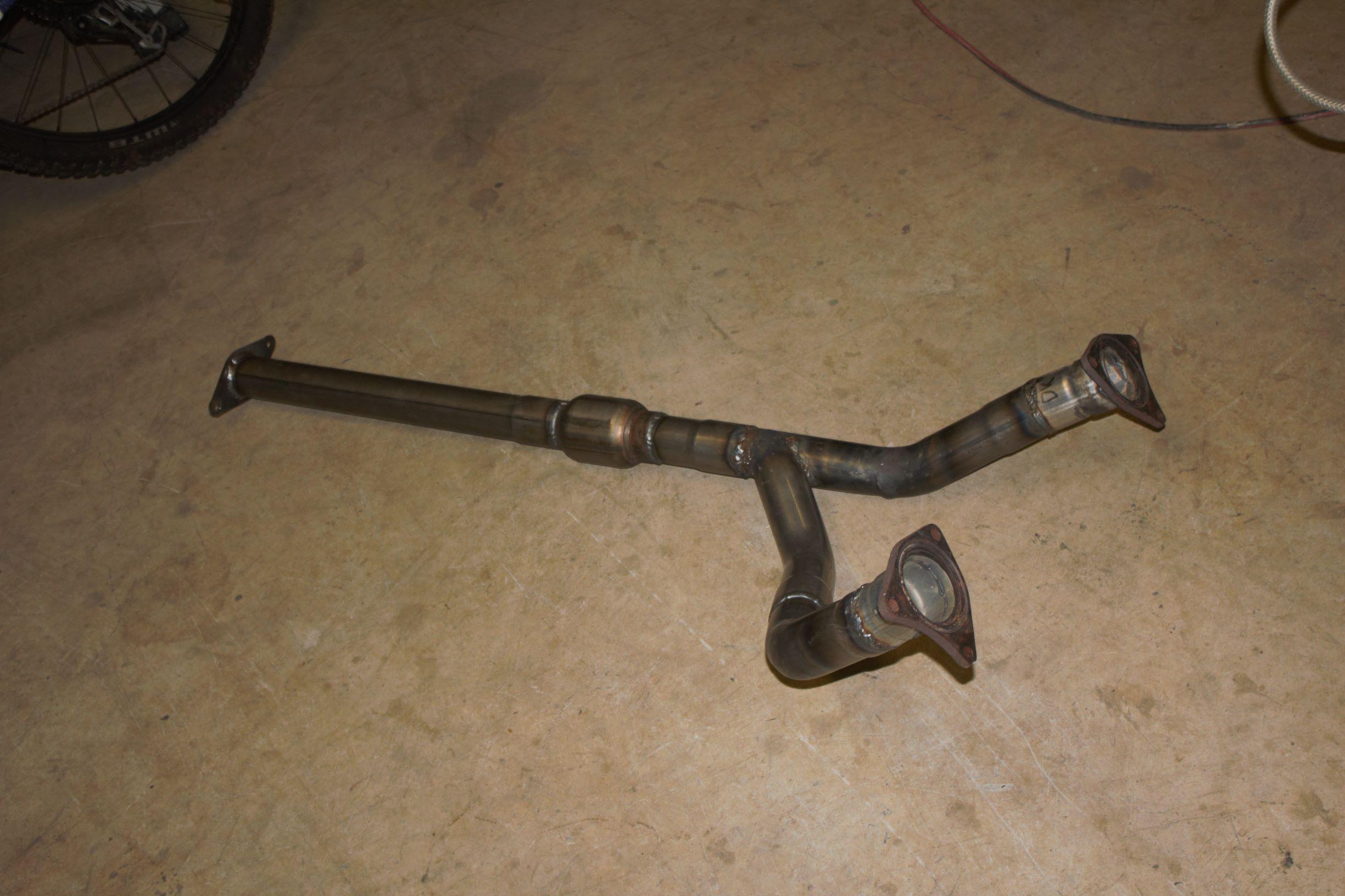 IMG_7340.jpg pulled some junkyard flanges for the manifold side, burned a couple out for the downstream end, ordered a 14$ "muffler" thats just a little tiny resonator, and made me a sad little crooked excuse for a Y-pipe
