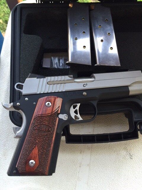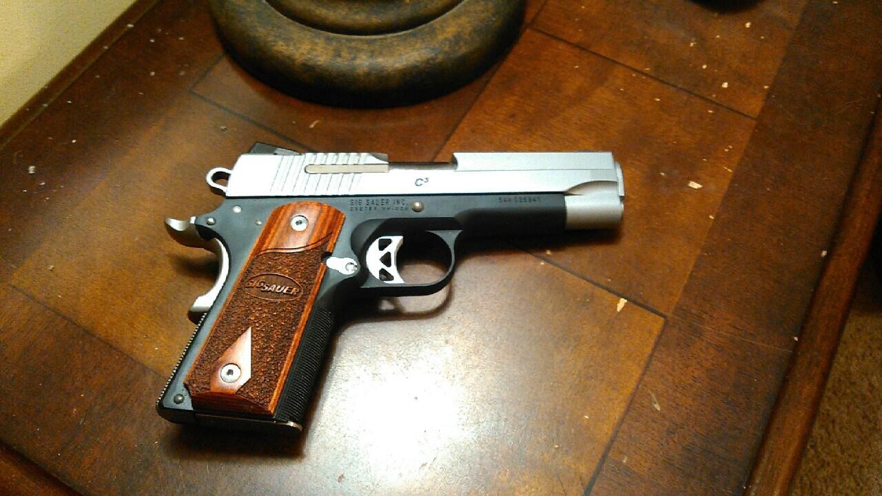 Sig C3 1911, nice gun only about 50 rounds fired. Comes with 2 mags and box. Nice rosewood grips, trigger is crisp. Very accurate pistol, Decatur al 900$ Obo cash or will look at trades. Barrel is 4.25 inches long