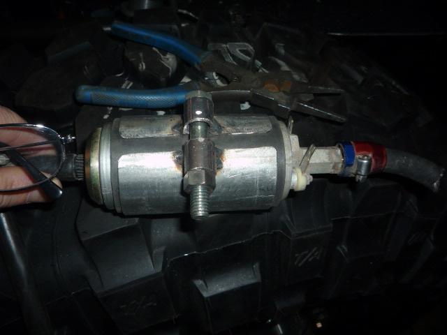 made another can to hold the fuel pump, from muffler pipe and a piece of 1/2" tube. with a piece of rubber around the pump it fits perfect.