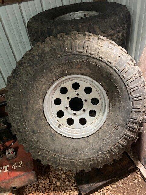I have a complete set of 36x12.50x15 Super Swamper TSL radials mounted on 6 hole Chevy / Toyota pattern wheels. All tires are good and hold air, no plugs or cuts. They have a bit over 1/2" of tread. $650 Text or leave voicemail @ 662-587-0034 North MS 38683