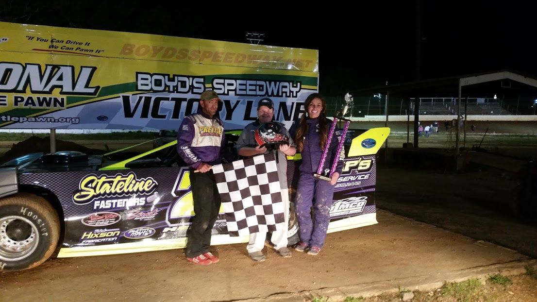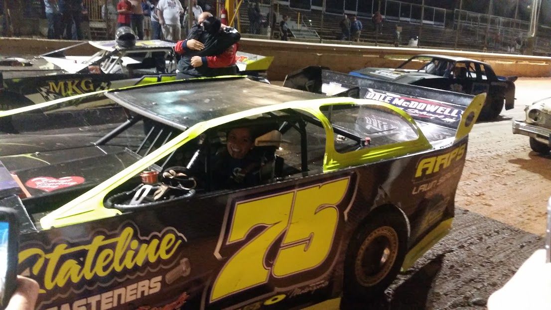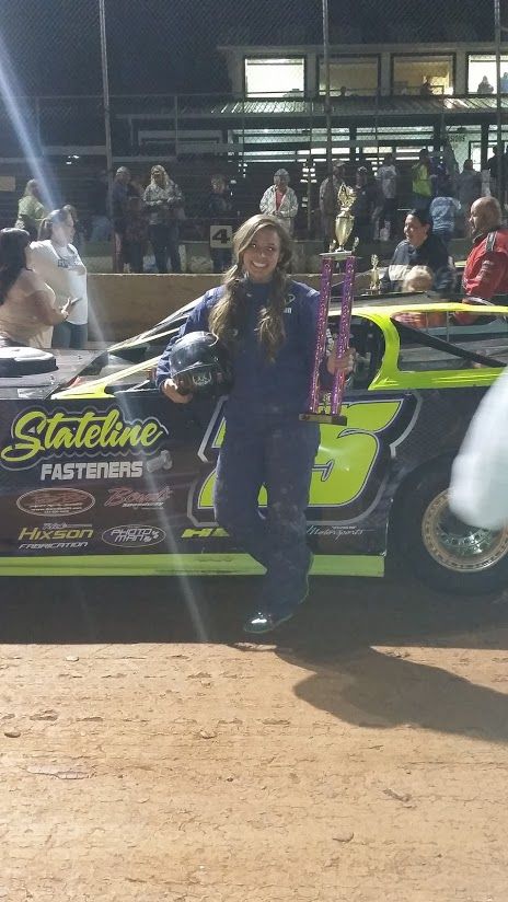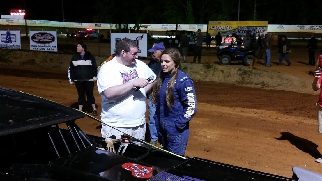 It was very cool. I got to meet this young man and his dad before the race. They came up and told me that he is a special needs child, he's a HUGE fan of dirt track racing, and that he bought a helmet with his own money to present to the winner of the powder puff race. Then they told me they saw me and thought I would win. I thought that was so sweet, but then when he came out after the race and presented this helmet to me... I was fighting back tears. How thoughtful! I told him we will have to get him out to an off-road event and let him check out some buggies ASAP! Such a sweet and respectful young man. It was a pleasure to meet them.