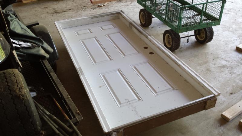 So the door that bob had hanging on the old wall was a wood exterior door and it was pretty hashed. Amongst the stuff I found a brand new metal exterior door that I want to use. The only problem is the bottom has to be cut off due to #1 I will constantly be tripping over it and #2 I won't be able to roll anything heavy over it.